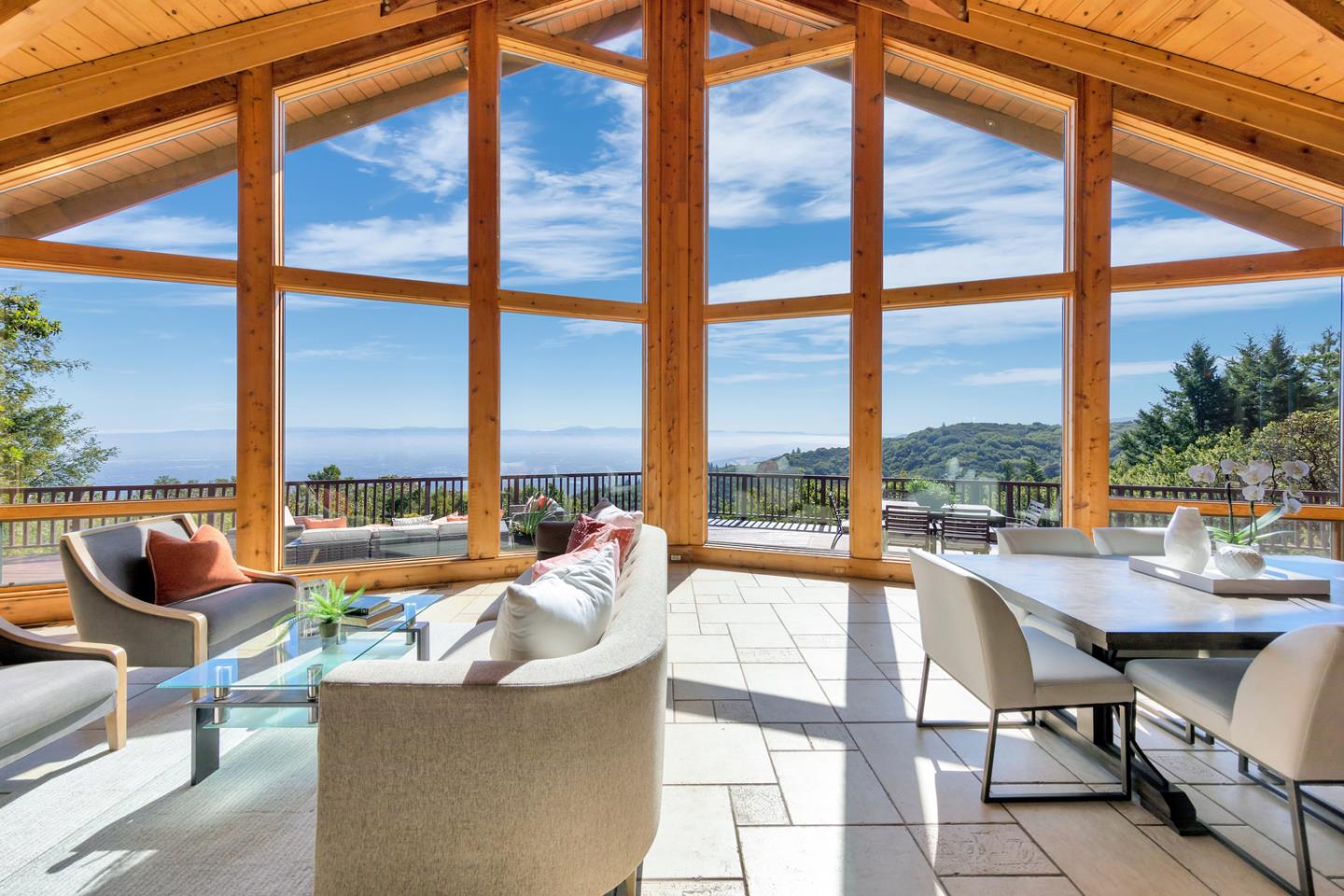 Welcome to 16880 Bohlman Road, an custom built cedar log home situated on over 11 acres with plenty of flat grounds and surrounded by stunning views of Silicon Valley from Mountain View to Morgan Hill. This is one of the few properties on the ridge with spectacular views of both sunset and sunrise AND boasting over about an acre of largely flat land, fully fenced and gated. Two garden spaces, one for a flower cuttings and one for vegetables, rows of lavender, maintained paths lead to a hidden patio with views of the East Bay. Featuring a gourmet kitchen with high end appliances, living room that opened to the deck, newly updated primary suite and upstairs loft area with great vantage points. Stone, tile and hardwood flooring throughout, detached 3 car garage and a separate guest house with one full bath and a kitchenette. Walk from your front door to amazing hiking + biking trails on El Sereno Open Space Preserve. Award winning Saratoga Schools!