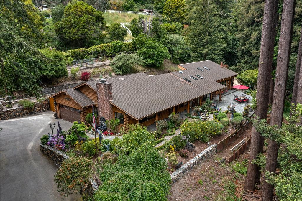 A private and secluded country feel while minutes from town. This awe-inspiring estate really shows off nature on almost 2 acres: a redwood cathedral, a large stone patio overlooking the trickling creek, flowing fountains and lush landscape. Truly a great place to enjoy your surroundings. Step inside to find a large, open and single level floor plan, a big kitchen that is central to the home and large living room and dining spaces. The ensuite bedroom is impressive with heated pathway stone floors, a river rock fireplace and vaulted ceilings. A spa-like bathroom with its oversized soaking tub, dual sinks and large shower with multiple massaging shower heads. Additionally, there are two more large bedrooms as well as two updated bathrooms. For reference, only 8 minutes from Downtown Santa Cruz, 10 minutes to Scotts Valley, 12 minutes to the Santa Cruz Beach Boardwalk, 45 minutes for San Jose International Airport and under an hour to many Silicon Valley company headquarters.