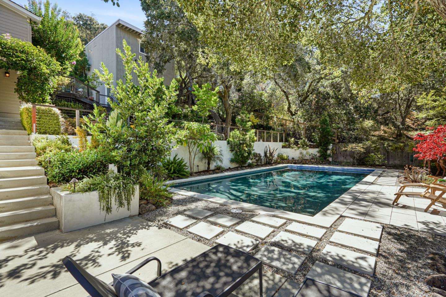 This stunning hillside estate in the heart of San Carlos is a truly special and unique offering. The nearly half acre parcel has been meticulously landscaped and rests under a canopy of mature oaks. A sparkling pool and canyon serenity create the feel of a private, quaint retreat. Multiple dwelling units on the property allow for flexibility and can accommodate a variety of modern living styles. The main level of the home is highlighted by a great room with vaulted ceilings and oversized kitchen island. Two bedrooms and a bathroom round out the main level. A sprawling master suite with private deck and office area is tucked away on a separate level. A separate living unit containing a bedroom, bathroom, living room and wet bar is separate from the home and is a perfect ADU candidate. Finally, a bonus office is located in a separate structure on the property and is the ideal work from home option.
