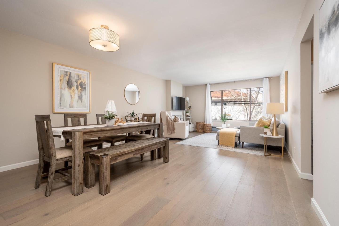 Top floor and fabulous San Carlos location! Nestled in downtown San Carlos, "The City of Good Living," this top-floor end unit is a fantastic find with excellent natural light. The open-concept living and dining room features a gas fireplace and a large picture window. The kitchen has white and gray cabinetry, beautiful quartz counters, subway tile backsplash, and recessed lighting. There are two bedrooms with ample closet space and an updated bathroom with quartz counters, a shower over the tub, and a linen closet. There is a dedicated covered parking stall with storage space in front of it. With highly rated San Carlos schools and located close to the vibrant downtown restaurants, shopping, and transportation, this is hip living at its finest!