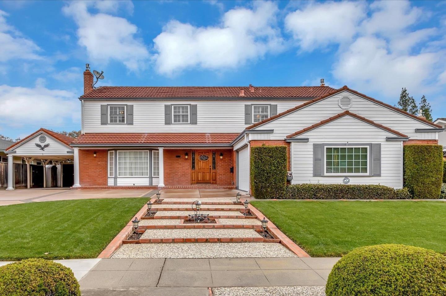 This beautiful Almaden Valley home features 5 bedrooms; 3 full baths; formal step down living room w/gas fireplace, custom mantle, double glass doors and bay window; formal dining room w/glass door to kitchen; remodeled kitchen w/oak cabinetry, granite counters, tile backsplash, pendant lighting and stainless steel appliances; dining nook; separate family room w/brick fireplace and built-in cabinetry; separate wet-bar area; separate office/utility room; primary bedroom suite w/walk-in closet, plantation shutters and sliding glass door to the private balcony; primary bathroom w/walk-in closet, linen closet and stall shower; other features include dual zone heating and A/C, dbl pane windows, hardwood floors, crown molding, wainscoting, 2 car attached garage and separate carport with extra storage; gorgeous rear yard w/covered patio, ceiling fan and retractable awning; built-in hot tub; fenced dog-run; Tuff-Shed and more! Award winning schools! Close to shopping, dining, library and more!