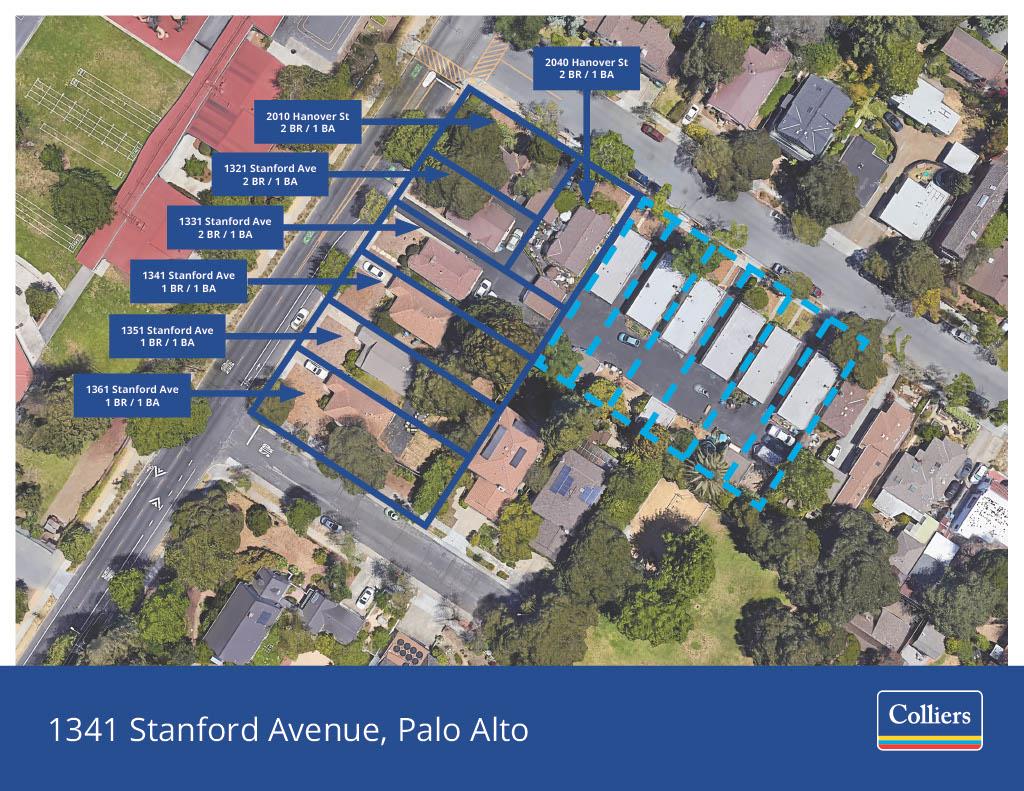 Once-in-a-lifetime opportunity to acquire an irreplaceable asset in Palo Alto (next to Stanford Univ.). 1341 Stanford (7 Homes), 2050 Hanover (6 Homes) available separately or together (13 Detached Homes). Individually-addressed, detached rental homes w/ front & backyards command higher rents compared to Apts. Low Operating Expense (tenants pay all utilities), low maintenance costs, and headache-free, easy management. Current CAP Rate (Avg Rent @ $3.4/SF): 2.11%/Current GRM: 25.7 AND Pro-Forma CAP Rate (Avg Rent @ $5/SF): 3.76%/Pro-Forma GRM: 17.6. High-End Remodel (Avg Rent @ $6/SF) CAP Rate: 4.77%/Pro-Forma GRM: 15.1. Cost/SF: $1,056/SF / Investors may consider modifying floorplans (add bedrooms & bath) and conduct high-end renovations of kitchen, bathrooms & fence up private backyards to achieve even higher rents. Potential for adding SF/expansion at back of property, also ADUs. Oversized Parcels offer tremendous future potential/possibilities. Co-Listed w/ Mark Zamudio