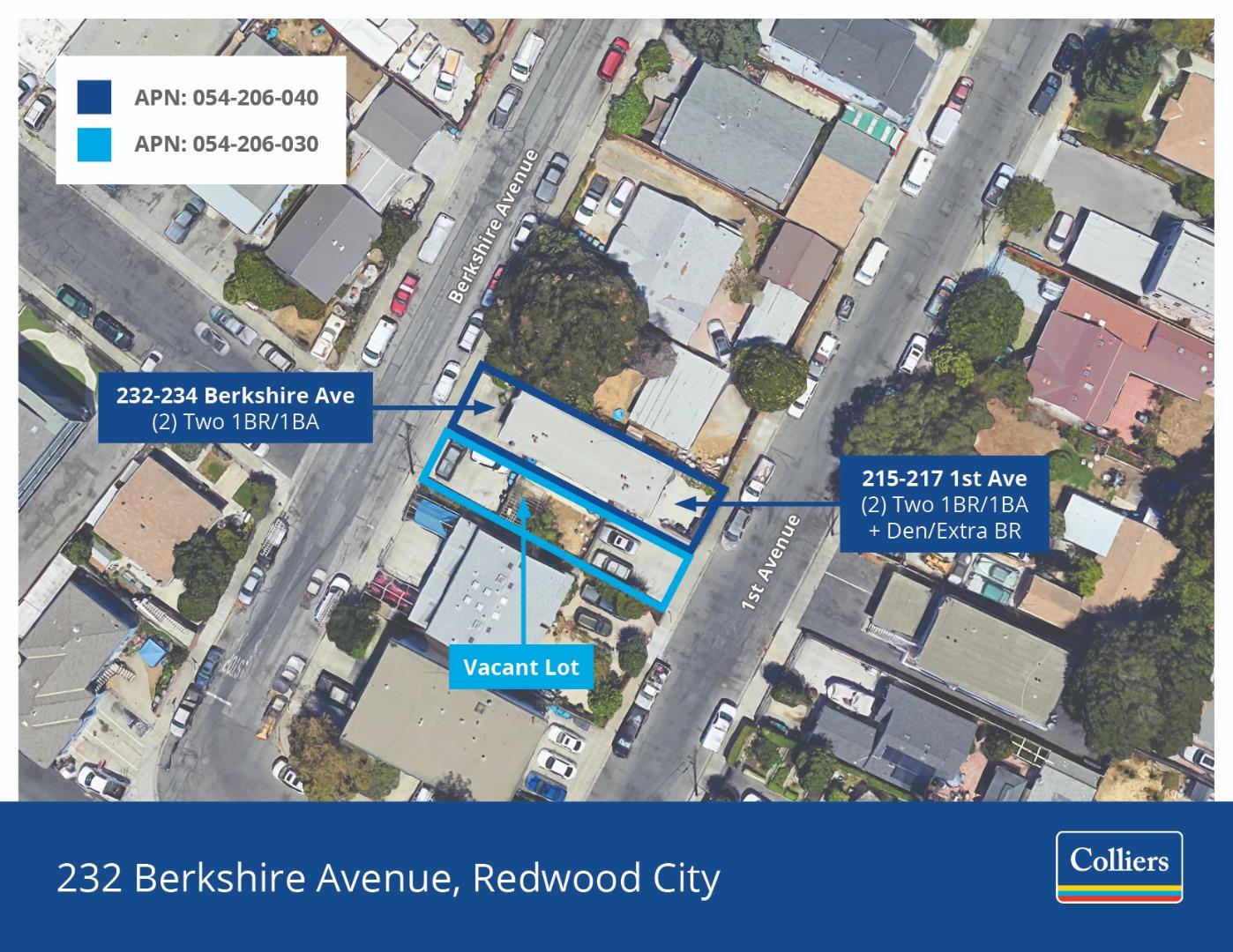 First Time on Market in 40+ Years! Best Value 4-Unit Property in Redwood City: 3.18% CAP on Current Rents & 5.0% CAP on Market Rents! Individually-Addressed Apt. Units: 232-234 Berkshire-Two (2) 1 BR/1 BA Units, 215-217 First Ave-Two (2) 1 BR/1 BA + Extra Bedroom/Den. 10 Total Parking Spaces. 2 Convenient Pull-Up Parking Spaces Per Unit. 2 APN's Offer Future Development Potential: 054-206-030 is Vacant Land (Used as Tenant Yard), 054-206-040 Offers 4 Easy-to-Rent Units w/ Immediate Cashflow. Current CAP Rate: 3.18%/GRM: 16.2. Pro-Forma CAP Rate: 5.0%/GRM: 12.3. Cost/SF: $578/SF. Separate Meters: Tenants Pay PG&E / Owner Pays: Water/Garbage. Functional Floorplans & Good Parking Access: Easy to Rent and Straightforward, Headache-Free Management. Strong Historical Tenancy. 234 Berkshire-Section 8 Housing: $1,282/Tenant: $223. Convenient Location Near Middlefield Rd, ECR, Woodside Rd/84, 101, 280. Proven Cash Cow Offering Good Hedge Against Inflation. Make Appt. w/ Agent Before Tour.