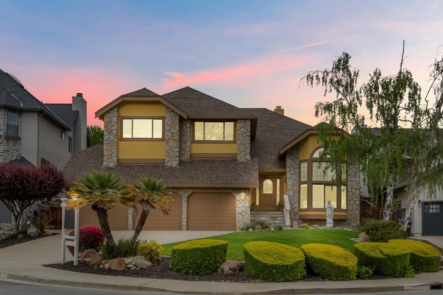 Welcome to this fabulous custom home nestled on a cul-de-sac of the esteemed Almaden Springs. The grand foyer features floor-to-ceiling picture windows, custom chandeliers, wide stairs case, and formal living. The beautiful stone front facade and elegant entry. This home offers a free-flowing main level with an elegant family room, a gourmet chef's kitchen equipped with a Thermador 5-burner cooktop, a Bosch dishwasher, a library, a fireplace, 2 wet bars, and a wrap-around porch. The primary bedroom has a view of the beautiful pool, balcony access, a wet bar, and a fireplace. Enjoy the expansive media room (5th bedroom option), and balcony access with a covered sitting veranda. 3 fireplaces for cozy evenings with family. Recently epoxy-painted garage floors, and additional storage cabinets. The backyard oasis evokes a private countryside retreat with an in-ground pool and manicured gardens. This tranquil estate can be your new home that has it all. Cul-de-sac location.