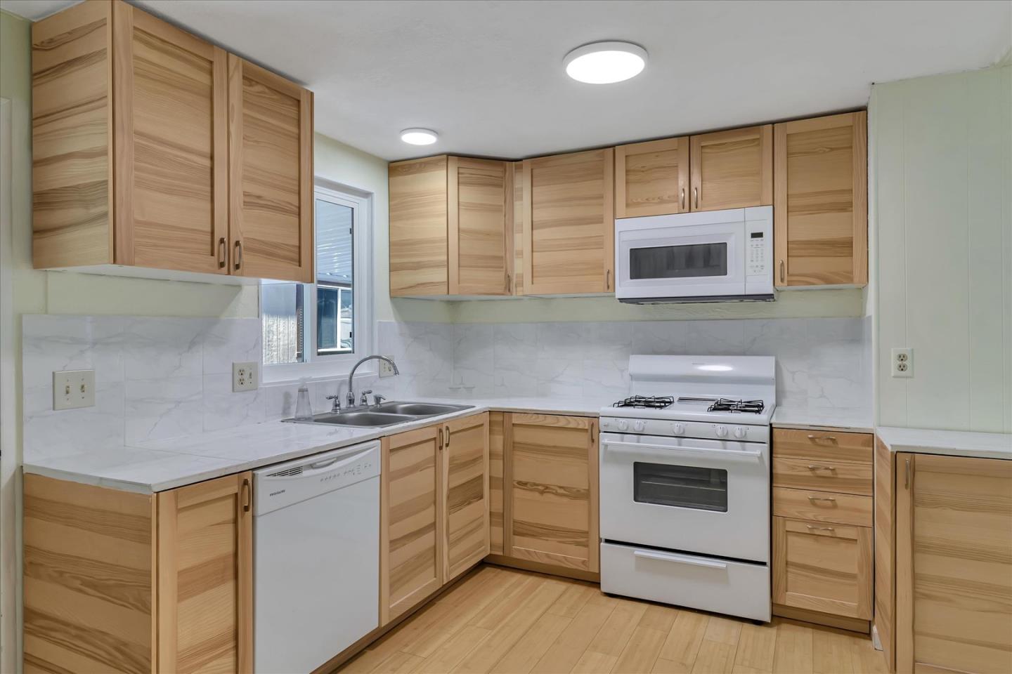 Look no further than this comfortable and affordable 2 bedroom, 2 bath home located in Mountain View's all-age community of Sahara Village. You'll find the living room featuring cathedral ceilings with decorative wood beams; bamboo laminate floors throughout; and spacious, versatile rooms. The remodeled kitchen is an open, light-filled space with plenty of wood cabinetry, spacious tile counter tops with matching backsplash, and white appliances. Most uniquely, there is a stackable washer and dryer located right next to the refrigerator. The master bedroom boasts a walk-in closet and a private bathroom. The second bedroom is a comfortable size, so in addition to a bedroom, it could easily serve as a home office, study, or media room. Other upgrades made by the seller include replaced siding and skirting on 3 sides, double-paned windows, water heater, furnace, and paint. Sahara Village is a well-maintained community with easy access to Hwy 85/237, public transportation, grocery stores