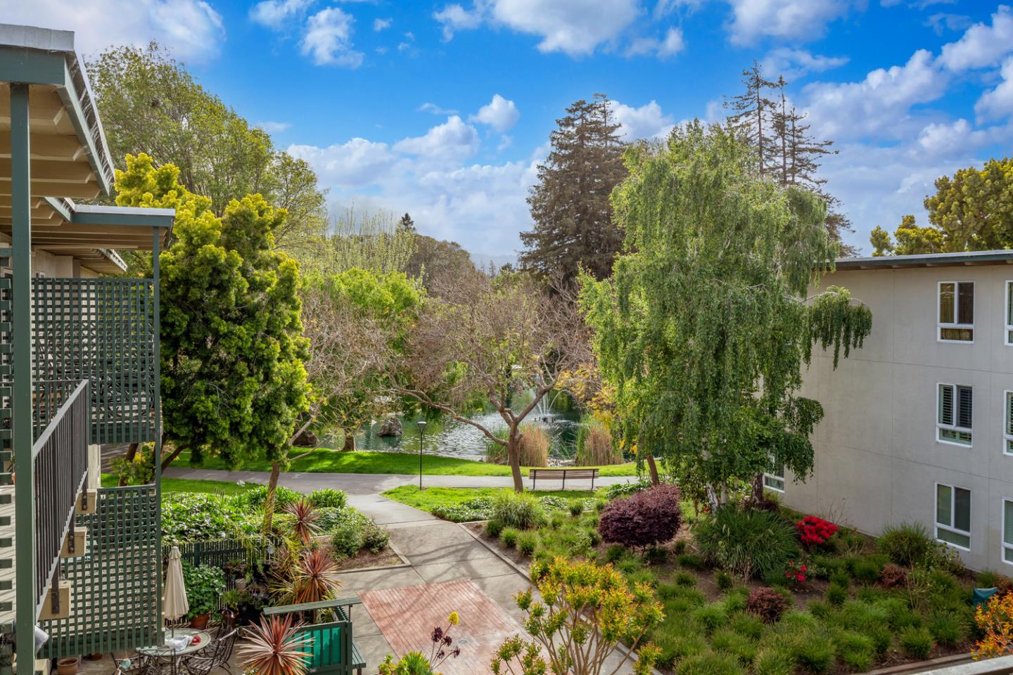 Rarely does this floor plan become available at the sought-after Woodlake community. Bright and light on the top floor, this updated condo has 2 bedrooms and 2 baths, including one en suite, plus beautiful views out to the community lake and the western hills beyond. Adding to the appeal is fresh paint throughout, crown moldings, new carpet, and luxury vinyl plank flooring in a wood-like finish in the foyer, kitchen, and bathrooms. The sparkling lake and lush green foliage take center stage from the living and dining room combination, which has a convenient pass-through to the kitchen for a wonderful open flow. Just outside the front door, a deeded storage closet plus shared laundry room provide added convenience. Woodlake is renowned for its superb community amenities with 6 pools, a spa, 2 saunas, 4 lighted tennis courts, a modern gym, billards room, clubhouse, and putting green. Less than one mile from Burlingame Avenue and next door to a shopping center with Starbucks and Safeway.