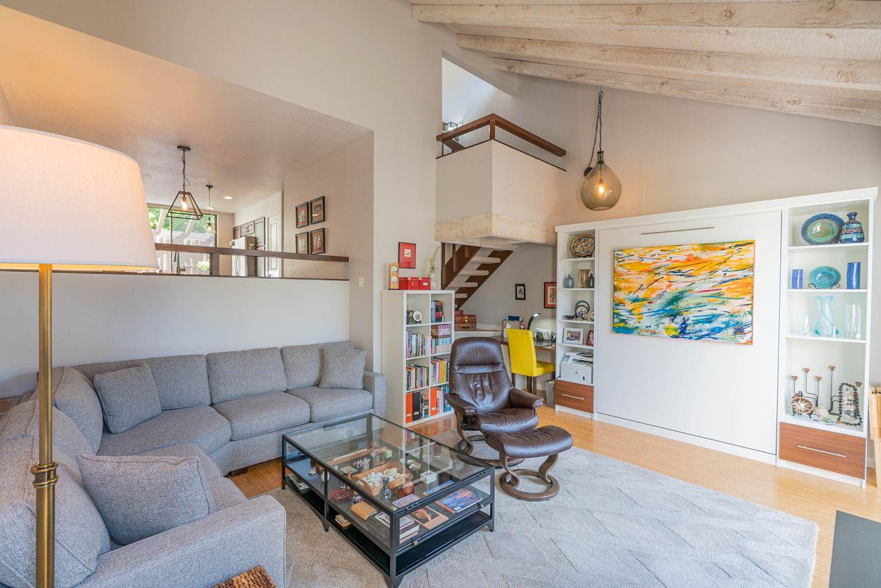 Beautiful Carmel Retreat, nestled in the quiet sought after "High Meadow" Carmel Complex. This large one bedroom Condo is a "Dream come true" The High ceiling living room was just equipped with a Murphy Bed Wall unit with shelves. Designer Hunter Douglas window treatments enhance the sliders going out to your balcony off the living room. Custom desk under the staircase, Upstairs Miele washer and dryer, with custom folding area. Bathroom has a double sink, and beautiful tile shower. Lots of storage throughout. The kitchen has stainless steel appliances, canned lighting and designer lighting. The Tv's stay with the Unit for your immediate enjoyment. The front entrance private stamped concrete patio invites you to enjoy the sunshine and BBQ next to your kitchen. Enjoy your private retreat with swimming pool, walkways and tennis in your own backyard.