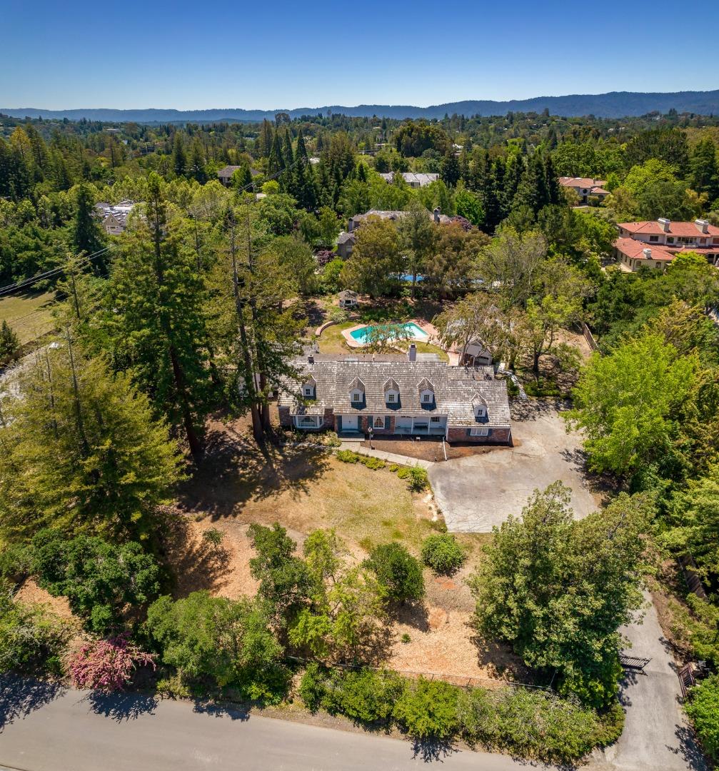 Two story traditional house with brick facade built in 1964. Approximately 1.18 acres. Electric gated entrance. Foyer with spiral staircase and stone floors. Formal living loom with wood-burning fireplace and gas starter. Formal dining room and eat-in kitchen. Family room with wood-burning fireplace and gas starter. Office with built-ins. Laundry room convenient to the primary suite. Two-car attached garage with paneled doors and electric garage door openers and loft. Full bathroom in downstairs hallway. Large main-level primary suite with vaulted ceilings, second laundry room, exercise room, two oversized walk-in closets, and en suite bath with dual-sink vanity, large shower, and jetted tub. Upstairs has three large bedrooms and one hallway bath. Central forced air heating and air conditioning. Free-form pool and gazebo. Pool house with vaulted ceilings, two dressing rooms, and full bath. Highly rated Las Lomitas schools.