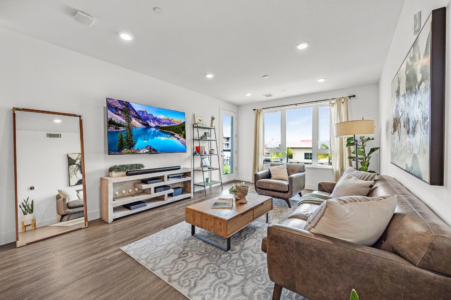 Wow this 4-year single-story, modern 2b2b+den condo offers a spacious open floor layout. Features include high ceilings, ample natural light, a well-equipped kitchen with S&S appliances, European style cabinets, full backsplash, and a generous quartz island. The versatile den can function as a formal dining room, home office, playroom, or a third bedroom. Two large bedrooms both have large walk-in closet. You will love the hill and pool view from the giant living room window. Enjoy the convenience of a dedicated laundry area, a private balcony, and access to amenities such as a pool, hot tub, clubhouse, BBQ area, and fitness center. Built-in Smart home control hub with keyless entry, smart doorbell and Nest thermostat. CAT6 Wiring, AT&T Fiber Ready. Two assigned parking spaces next to the elevator. The location is perfectly situated near parks, shopping, dining options, and offers easy access to freeways 85 and 101. Close to IBM, Western Digital and other tech companies.