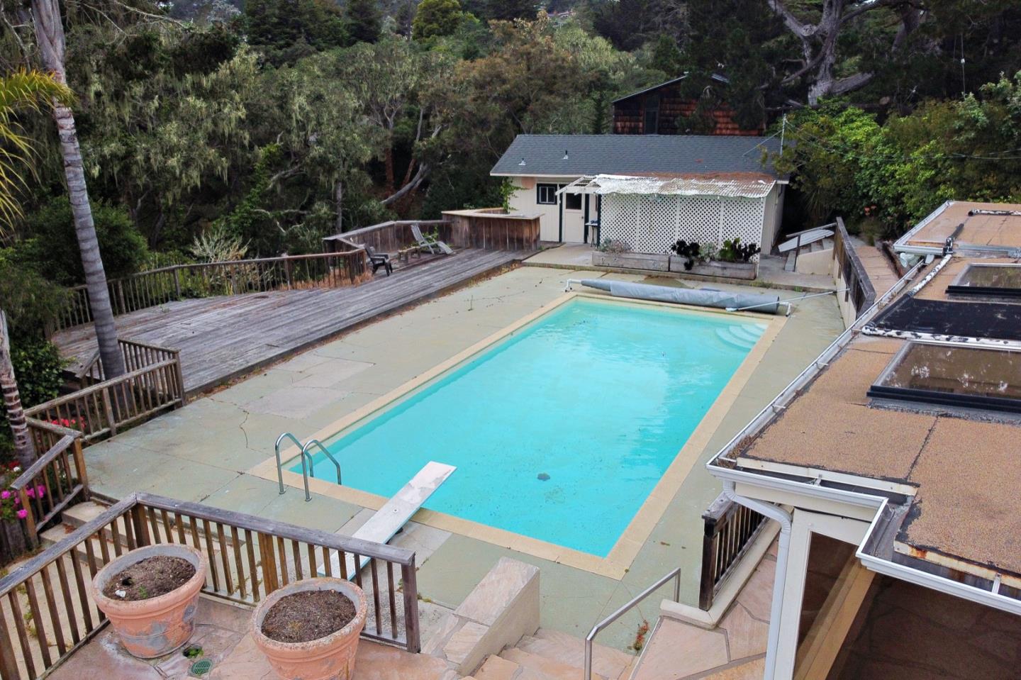 Drive to the top of Madison St. in Monterey and leave the city behind. Open the door to number 769 and enter a sublime space with a huge Montana-like sky bathing light on a shimmering swimming pool, decks, and vast entertainment areas. Classified by the county as a Multi Family Dwelling there is a 3 bed 2 bath main house plus a 420 sq. foot studio guest house with a bath and kitchen area. It is a surprising jewel within walking distance to downtown Monterey.