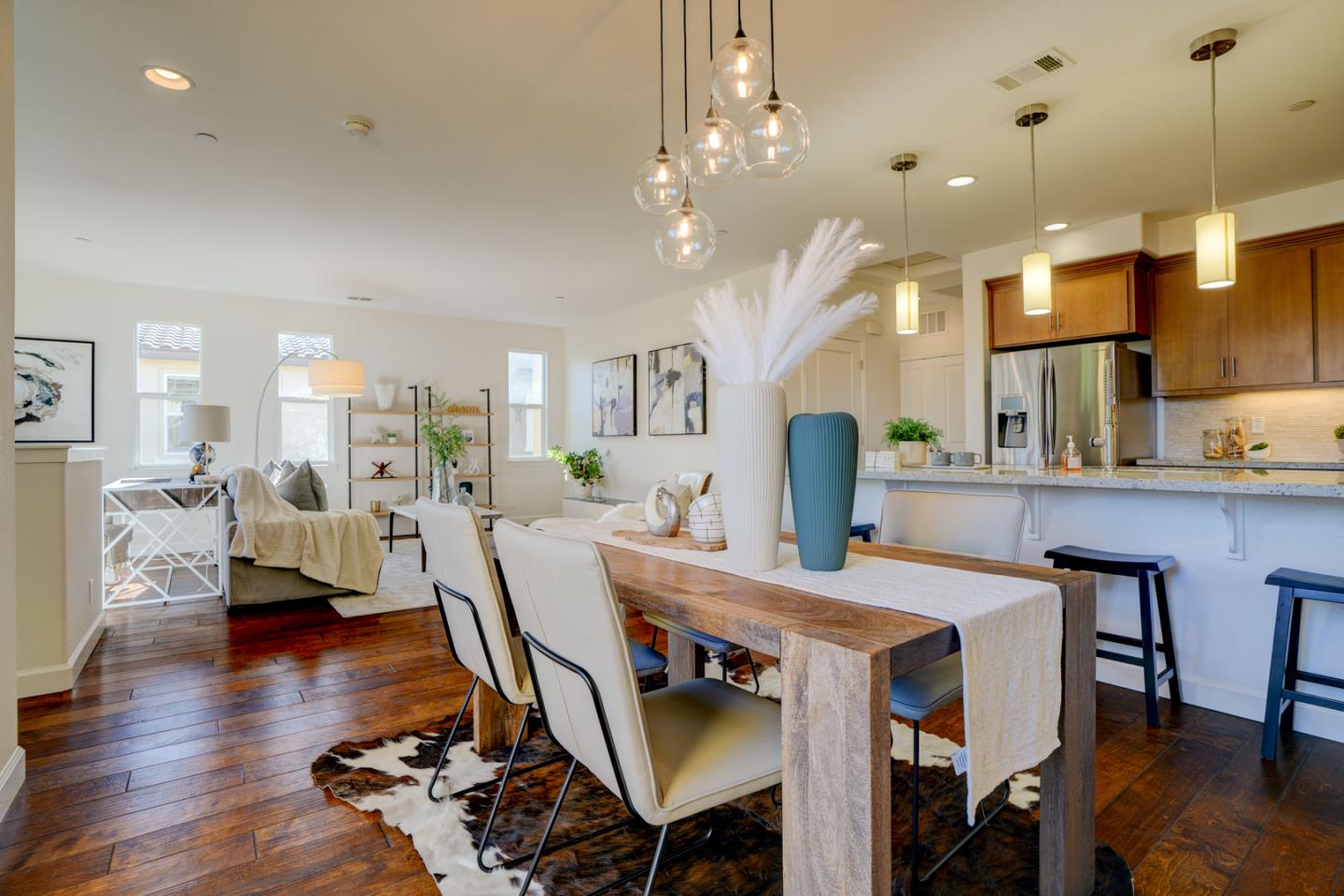 Luxurious 2-bed, 2-bath townhome in Fusion Sunnyvale! Abundant natural light fills the space with extra windows. Open living room with cozy study area, ideal for office or children's play. Desirable floor plan with gourmet kitchen, large breakfast bar, and in-unit washer/dryer. Oversized master suite features extra windows, walk-in closet, dual sinks, and high ceilings. Spacious 2nd bedroom with ample storage. The Fusion community offers a wealth of amenities for residents to enjoy, including movie theater, party hall, gym, golf putting green, play area, and BBQ. Close to newly built parks, major freeways, Apple, Google, Amazon, LinkedIn & more. Short drive to Sunnyvale downtown and CalTrain. Easy access to 101, 237 & Lawrence. Major developments nearby. Don't miss out on the chance to make this luxurious townhome your own!