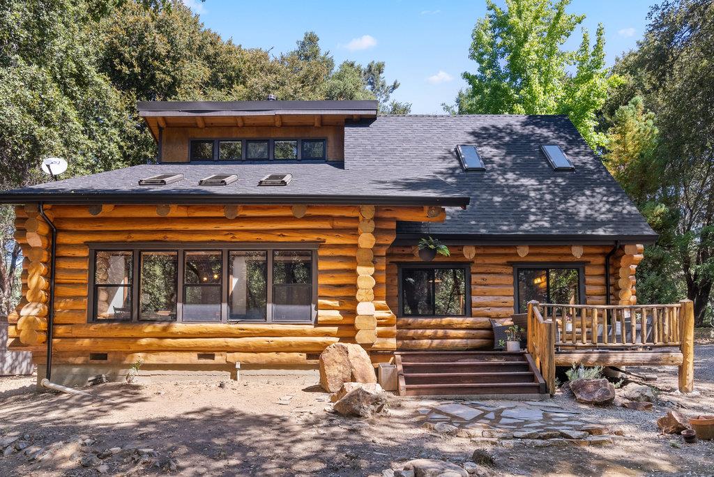 Enjoy this peaceful retreat, where a meticulously maintained true log cabin awaits you on 2 flat and usable acres. With 3 bedrooms and 2 bathrooms, this rustic home exudes warmth and character. Vaulted ceilings, wool carpets, and a wood-burning stove create a cozy ambiance, while the open kitchen and dining areas provide a perfect space for gatherings. The updated full bathroom adds a modern touch, and the large laundry/mudroom affords daily practicality. Enjoy the serenity of the sunroom and the comfort of the front porch. The cabin also features an upstairs loft, perfect for relaxation or work. Plus, the new roof in 2023 ensures peace of mind. Embrace the essence of log cabin living, with the convenience of easy access to shopping, beaches, trailheads, and UCSC. Designed and built by Homestead Log Homes, and complete with a finished workshop, two storage sheds, and plenty of parking. Choose to call this log cabin home, and experience an authentic and tranquil lifestyle surrounded by nature!