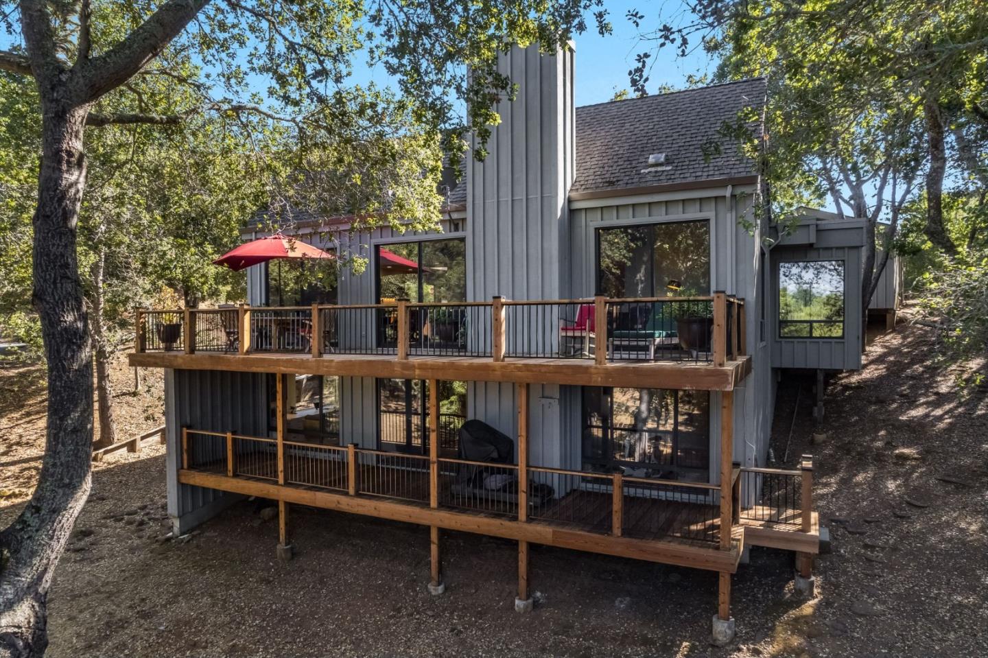 Enjoy the natural light streaming through this 3 BD/3.5 BA 3,005 sq ft modern home situated on 0.46 acres in the exclusive Portola Valley Ranch community. Wood detailing and many windows epitomize California living. Countless skylights set within vaulted wood-beamed ceilings fill the grand entry, living room w/ custom fireplace & dining room. Decks span the length of home on both stories, taking in sprawling vistas. Large eat-in kitchen w/ ample cherry cabinetry & granite countertops has its own deck adjacent to cozy breakfast nook w/ built-in buffet. Relax in the private hot tub just off primary suite's sunroom. The optimal floor plan promotes family living with spacious primary on main floor while family room, guest bedrooms and guest bathrooms are downstairs. Enjoy the numerous amenities like the 2 pools, 3 tennis courts and hiking trails. It's a quick commute to Palo Alto and Silicon Valley, but the hundreds of acres of surrounding open space lends an easy bucolic feel.