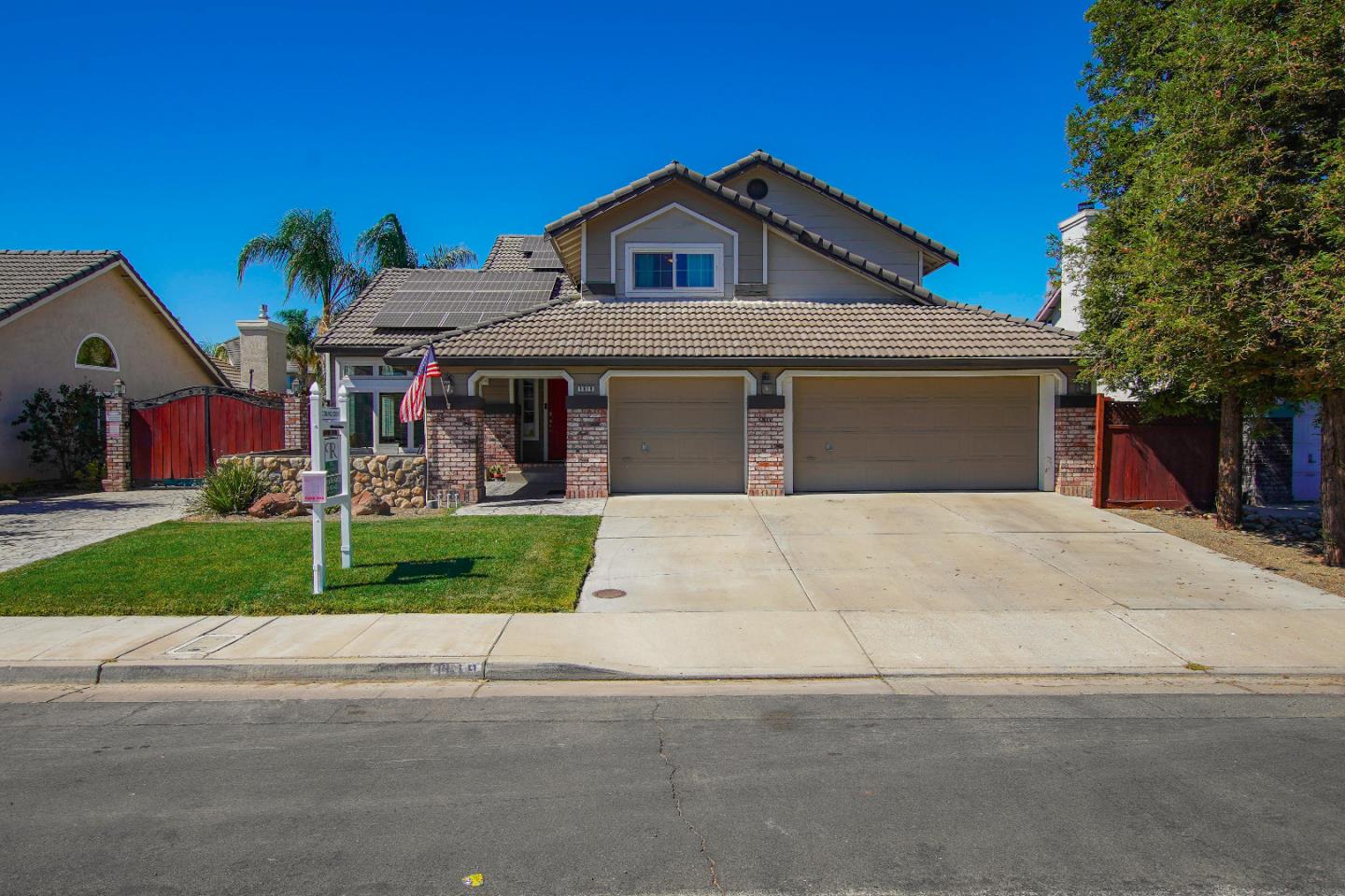HOME FOR THE HOLIDAYS! Welcome to this stunning, formally a model home! As you walk in, you are greeted with beautiful high ceilings and a warm and welcoming concept.The stairwell is gorgeous for those picture perfect moments.This home not only has 4 bedrooms with one bedroom downstairs, it has an extra office/den room for guests or a hobby room. This home has so many upgrades and updates, from the fire place and sunken tub in primary bedroom, a wet bar,beautiful slate flooring, granite counter tops, solar, to the custom built bar/entertainment area with it's own private door. It does not stop there, this home has a beautiful kidney shaped solar powered pool! Do you have an RV? This home has an extra large concrete stamped space for your RV'S or rec. vehicles! Did I mention Location!?This spectacular home is just two mins from Hwy 152 for an easier commute time, a park nearby, and a huge shopping center for all your needs! Time to open the door to YOUR place called HOME.