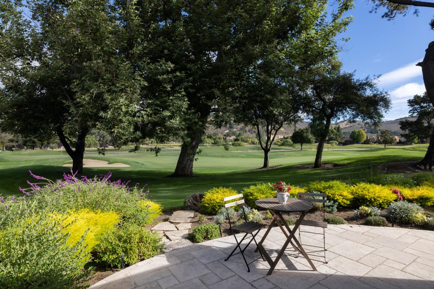 Boasting arguably the most expansive golf views of any Carmel Valley Ranch golf front home, this rare freestanding unit offers sweeping course and mountain vistas. Enjoy close-up views of the 1st green from the luxury of your main living areas where you can watch golfers chip & putt for that coveted birdie! Generous floor-to-ceiling windows in the living room, dining room and spacious, open kitchen fill this home with nature and light. Dramatic soaring, wood beamed ceilings open to the upstairs creates volume & architectural interest. Sitting at the end of a private cul-de-sac, the homes spacious 2,892sf includes two primary ensuite bedrooms (one up, one down), and a third main level bedroom with guest bath. A roomy den that opens to a private, fenced front patio with flagstone walkways and lush greenery. New wool carpeting throughout and a standalone 2-car garage are other highlights. Behind the gates of the popular CV Ranch community, your golf-front lifestyle awaits!