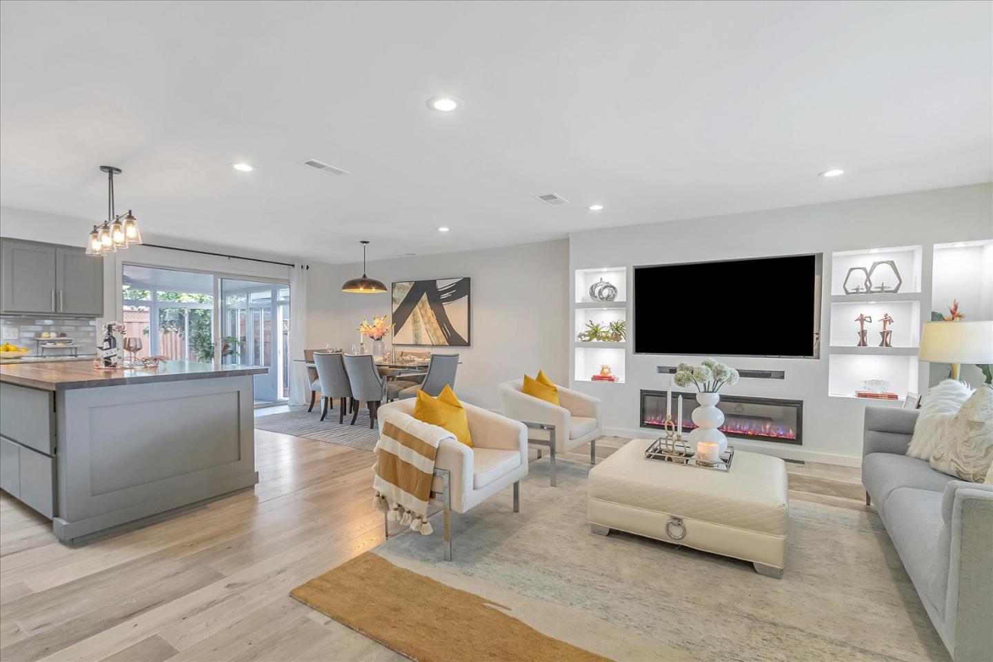 Beautifully updated contemporary home, located in desirable Cambrian Park neighborhood. Thoroughly remodeled with spectacular open-concept floor plan. Stunning linear fireplace. Open to the living areas, the skylit kitchen features abundant cabinetry, long granite countertops with glass tile backsplash, and a large wood-topped center island with counter seating. Formal dining area has a sliding glass door to an expansive sunroom, which is lined with windows and sliding glass door. 3 bedrooms and 2 baths include a primary suite. Secluded rear yard with an entertainers deck, patio, and lush lawn. Moments-away proximity to Hough Park, shopping and dining at Cambrian Park Plaza, and easy access to major tech employers and commute routes. Highly sought-after school district. Home is 1,234 SqFt and permitted all weather enclosed Patio of 442SqFt