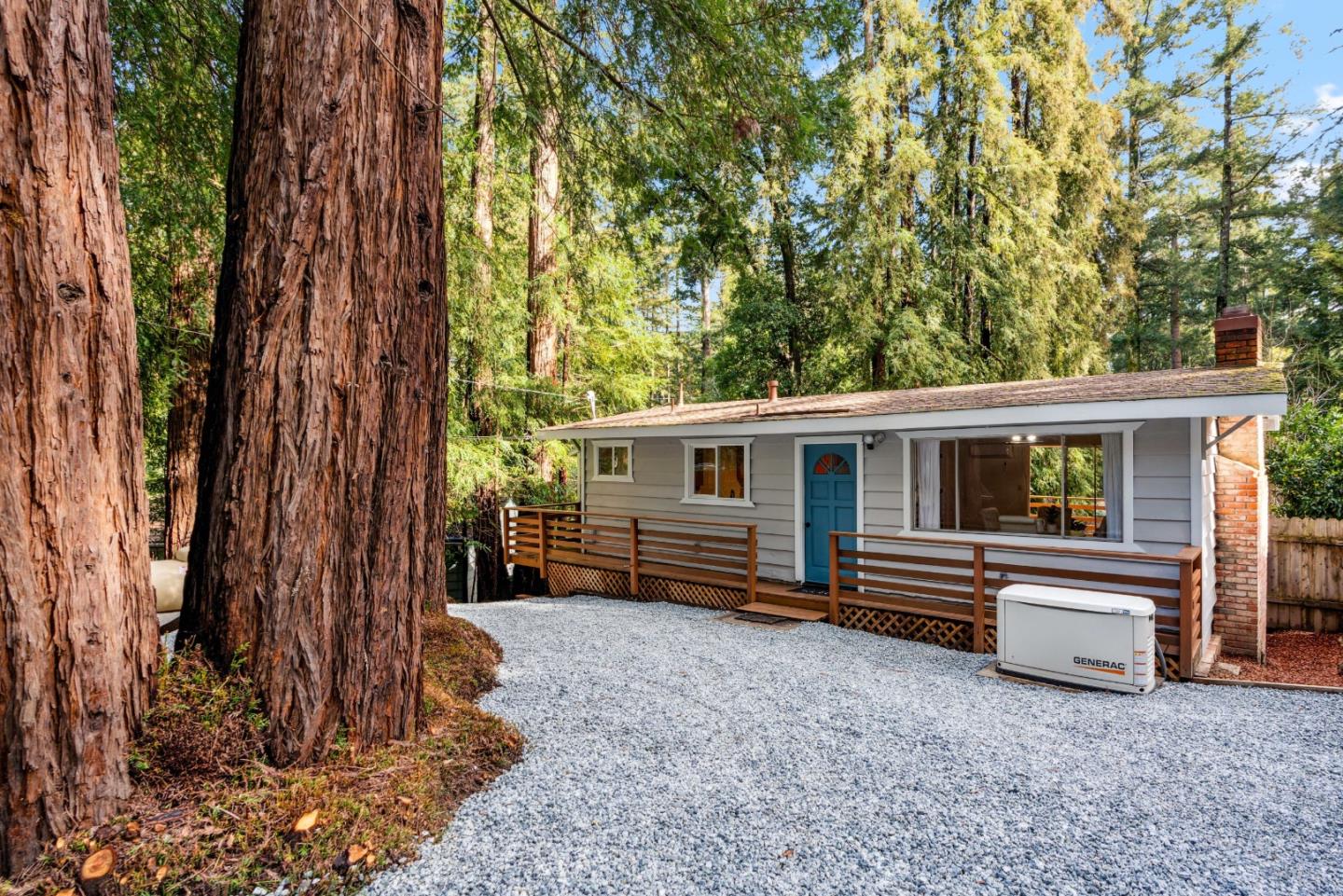 This romantic cabin in the forest offers the perfect blend of tranquility and convenience, with easy access to Loch Lomond and an open-concept layout featuring a vaulted redwood ceiling and solid frame. The spa hot spa in the bathroom adds luxury, while parking for up to 4 cars and a low-maintenance yard ensure easy upkeep. Breathtaking views from the living room and remarkable wildlife like deer and turkeys enhance the property's charm. Mature Fuji apple and orange trees produce abundant fruit, plus lemon, peach, and fig trees. The cabin is easy to heat and cool, enjoys serene morning sun filtering through the trees, and lots of sunlight throughout the day. It's close proximity to downtown Felton, tranquility at night, and close access to Santa Cruz without the need for highway travel make it an ideal retreat. Nearby Henry Cowell and swimming holes like the Garden of Eden offer outdoor recreation, while local restaurants and music venues provide exceptional dining and entertainment. The covered redwood deck is perfect for coffee and BBQs, and the home is equipped with a new 200-amp electric panel, a 22kW whole house generator, fiber internet with 1 Gbps speed, and a multi zone mini-split system with newly insulated walls for comfort.