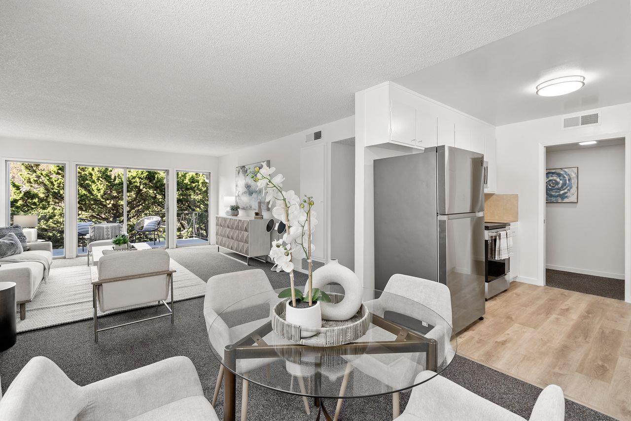 MENLO PARK SCHOOLS!! JUST IN TIME FOR FALL!! BIG POOL!! Welcome home. Fresh paint throughout, providing a blank canvas for your personal touch. This space effortlessly adapts to your lifestyle, offering comfort, convenience, and endless possibilities. With two bedrooms and two full baths, this layout is perfect for co-habitation or creating a home office space and maybe add a Murphy bed? HOA allows in-unit washer and dryer. Enjoy the durability and modern aesthetic of commercial grade carpet squares underfoot, complementing the contemporary design. Step outside to the serene deck, adorned with a beautiful Juniper tree for privacy and tranquility. The kitchen features brand new appliances and a floor to ceiling wall of storage cabinets for additional dry food and all your extras. This secure building offers a gym with sauna, secure bike parking, additional storage area, and updated fenced-in community pool with a large lawn area for warm weather enjoyment. An unbeatable location, very close both downtowns of Menlo Park and Palo Alto, Burgess Park, civic center, Caltrain, award winning Menlo Park Schools and easy access to Facebook, Stanford, El Camino and 101. One deeded parking space in secure garage with elevator, plus open parking on the back lot off Willow Road. Enjoy!