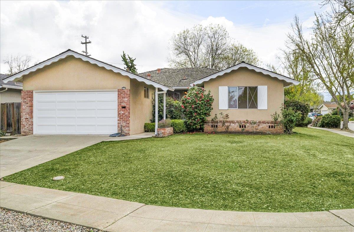 VERSATILE HOME ON PEACEFUL CORNER LOT | Situated on a large corner property in a peaceful pocket of Sunnyvale, this home near excellent schools offers a flexible floorplan and spacious lotprime for remodeling or expansion. A brick fireplace accentuates the central living room, where a pocket door reveals a light-filled dining/family room with wet bar. Relaxing bedrooms include a primary suite with walk-in closet and backyard access. Enjoy hardwood floors, new paint, a peninsula kitchen with refinished cabinetry, and an oversized, attached two-car garage. The private backyard is anchored by multiple trees, including mature fruit varieties, and presents an expansive covered patio perfect for outdoor entertaining. Blocks away from Ortega and Panama Parks and Stocklmeir Elementary while also located near other exceptional Cupertino schools (buyer to verify). Convenient to shopping, dining, freeways, and campuses for Apple, Kaiser Permanente, and more.