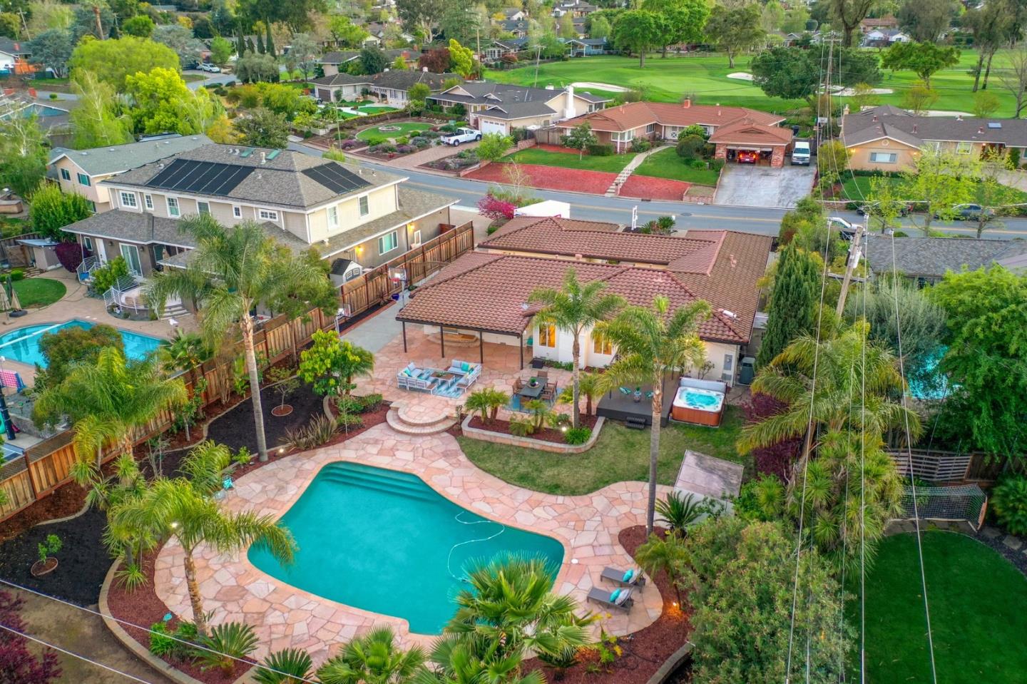 Almaden Valley Country Club neighborhood! Single-story-oversized double lot of half acre! Rare amenity-an oasis for outdoor living! Expansive flagstone paver patio, sparkling pool, spa, mature landscaping will captivate! Paver driveway leads to courtyard entry. Fresh paint inside & out, new garage door, exterior lighting. Picture windows thru out showcase beautiful views. Thoughtful floor plan w/ generous living spaces, 5 beds/2.5 bath. Living room w/ vaulted ceiling/oversized windows frame captivating views, formal dining. Kitchen w/ nook, large family room. Primary suite w/ access thru the sliding doors to rear wood deck/spa, walk-in closet & spa-like bath. Beautiful grounds-Sparkling pool beckons on warm days. Large patios for entertaining or relaxing. Versatile workshop or playhouse, greenhouse & array of fruit & palm trees. Ample storage in shed or oversized detached 2-car garage. Lg gated & paved side yard perfect for RV, boat or oversized vehicles. Steps from parks, hiking trails, Country club, Tennis club! Top Almaden Schools, Williams, Bret Harte Leland!