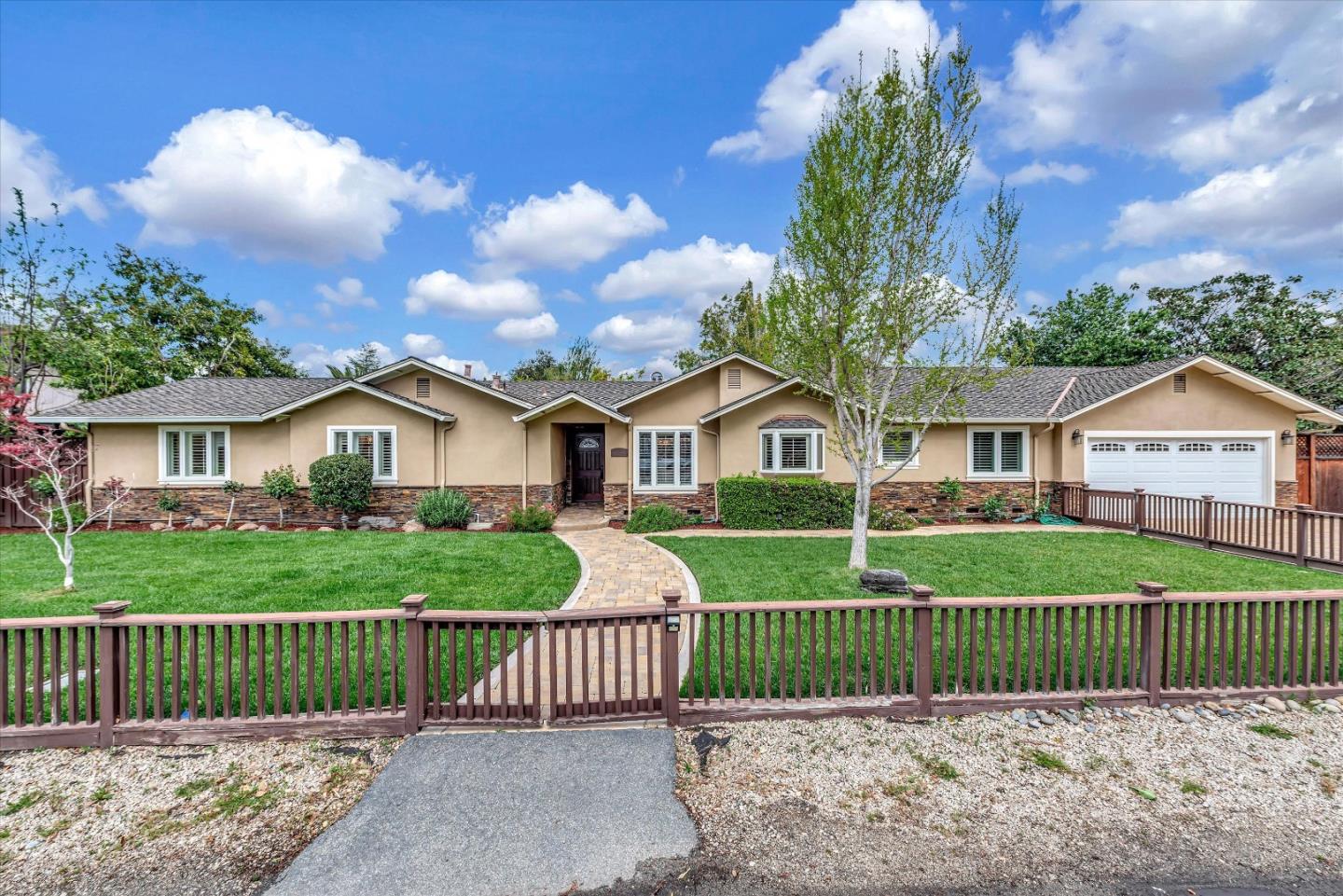 Discover prime Silicon Valley living in this stunning Los Altos home, boasting timeless elegance and modern functionality. Brazilian cherry wood floors and blazing red cherry paneling adorn every room, creating a warm and inviting atmosphere. A living room features a wall of windows overlooking the fabulous rear grounds, filling the space with natural light. The gourmet kitchen is a chef's dream, equipped with a center island, wet bar, and high-end appliances. Two luxurious bedroom suites include a master retreat with a marble bathroom featuring a double-sink vanity, walk-in closet, shower, steam room, and jacuzzi bathtub. Outside, the rear garden offers relaxation and entertainment with a manicured lawn, patio, deck, outdoor kitchen, and sport court, all surrounded by lush landscaping and mature trees. Additional highlights include a custom-engineered den in the garage and proximity to Silicon Valley's top tech companies. Located within the acclaimed Cupertino Union School District, this home ensures exceptional educational opportunities. Live the Silicon Valley lifestyle in this captivating Los Altos residence , where sophistication meets functionality and luxury.