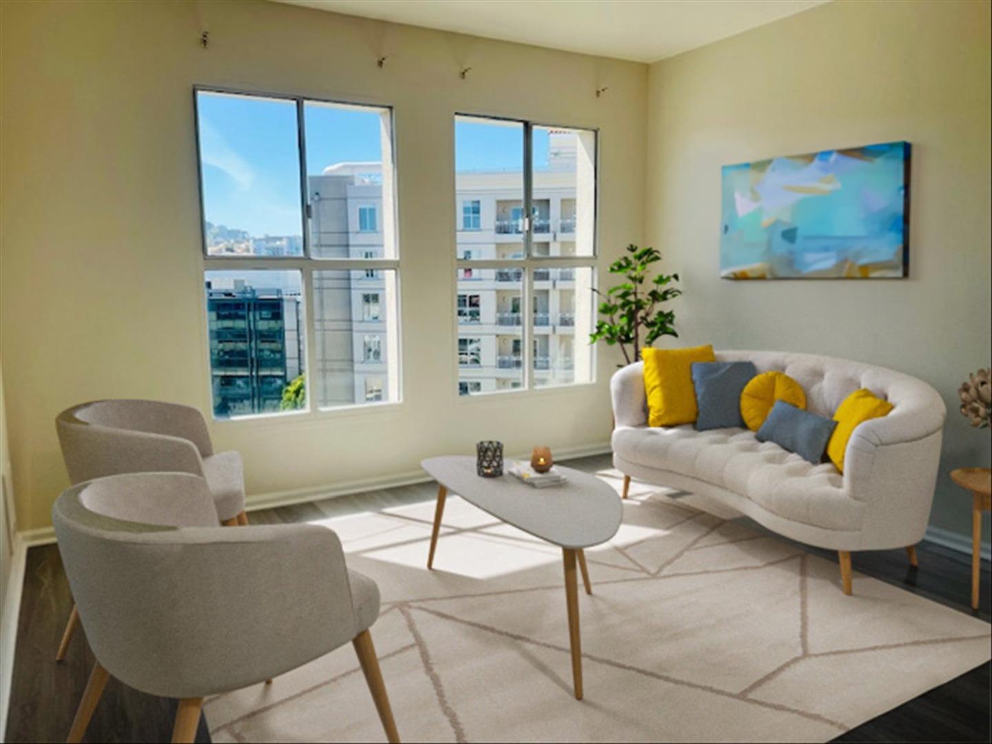 PRICE REDUCED! Welcome to this cute 1 bedroom unit in a luxury condo complex in the heart of San Francisco, perfect for a starter home. Located on the 10th floor facing the courtyard, this bright unit offers tons of natural light, new laminate flooring, new carpet in the bedroom, fresh interior paint and ample storage space. The kitchen features a granite island and countertop, maple cabinetry and new matching appliances. Huge walk-in closet can be a small bedroom or office space. Convenient in-unit laundry and deeded storage on the 2nd floor. Amenities include fitness studio, 24/7 gym, affordable leased parking, hi-speed lifts, conference room for private meetings and courtyard for barbeque and entertainment. Walking distance to MUNI & BART, world class entertainment, restaurants, museums, etc. Tech shuttle buses stop at your doorstep. Pet friendly. Easy access to freeway 101 & 280.This unit is virtually staged.
