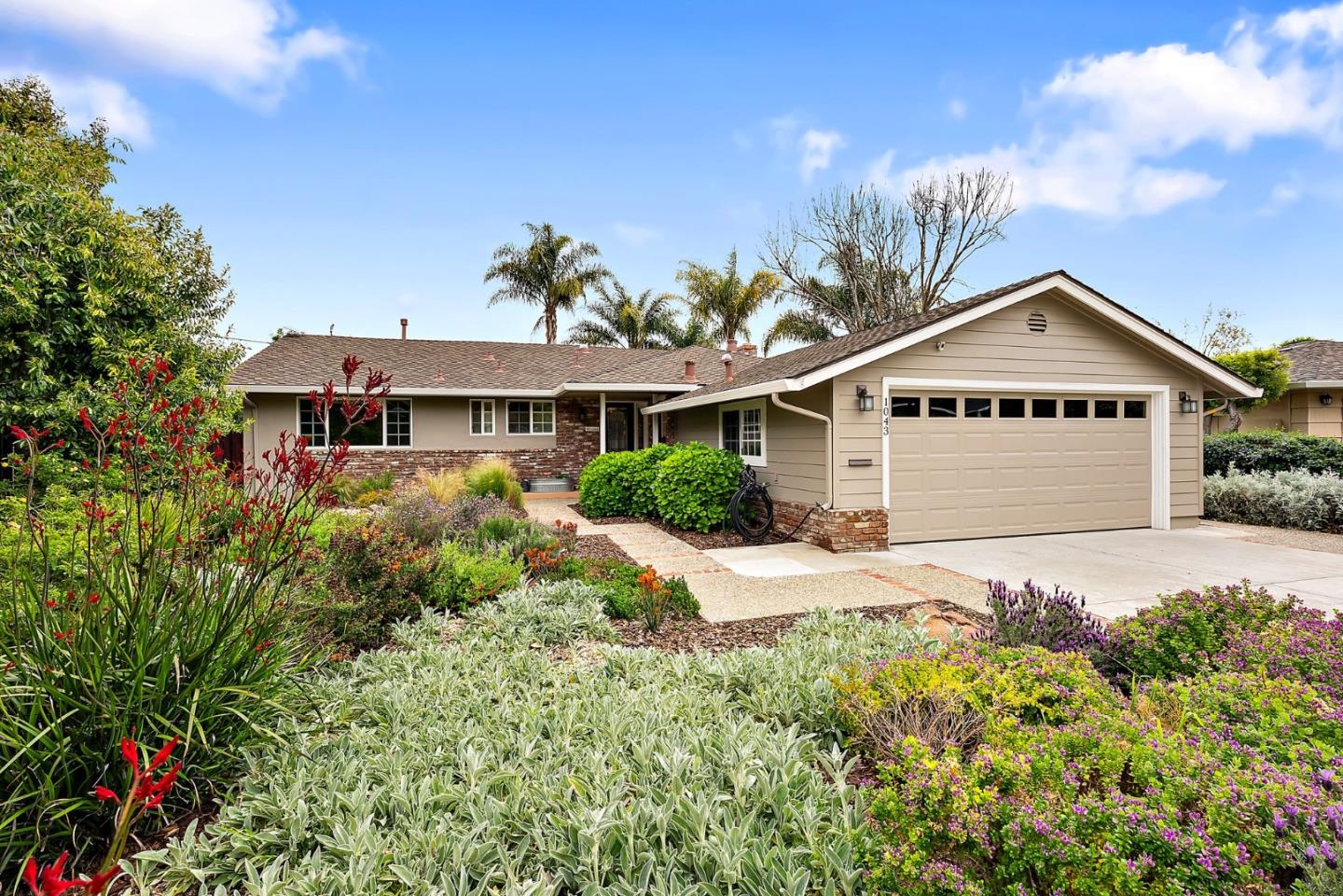 Welcome to 1043 Eugne Ct! Nestled at the end of a cul-de-sac in the coveted West Valley neighborhood of Sunnyvale, this well-maintained single-story home offers an ideal floorplan w/ 4beds, 3baths & 1,954 sqft of living space on an expansive 10,500 lot. Upon entering the home, you'll be greeted with/ an abundance of natural light illuminating the interior from every corner. The well-designed floor plan seamlessly combines the LR & dining area, both of which have sliding doors opening onto the serene backyard - great for indoor/outdoor living. The chef's kitchen is complete w/ a DCS gas range, SS appliances, built-in wine fridge, ample hickory cabinetry, expansive countertops, island w/ sink & a bay window overlooking the patio. Down the hall, solar tunnels light the path to 2 primary bdrms w/ ensuites; one of which grants access to the wooden deck w/ built-in spa, two spacious bdrms & an updated guest bthrm. The private backyard is a true oasis, boasting a multi-level layout w/ mature palm trees, in-ground pool, raised planter beds, shed & sprawling brick patio. Enjoy the amenities of central HVAC, ceiling fans, leased Tesla solar panels, att'd 2-car garage w/extra storage, top-rated schools & a prime location close to retail shops, parks, schools, major Tech Co. & more!