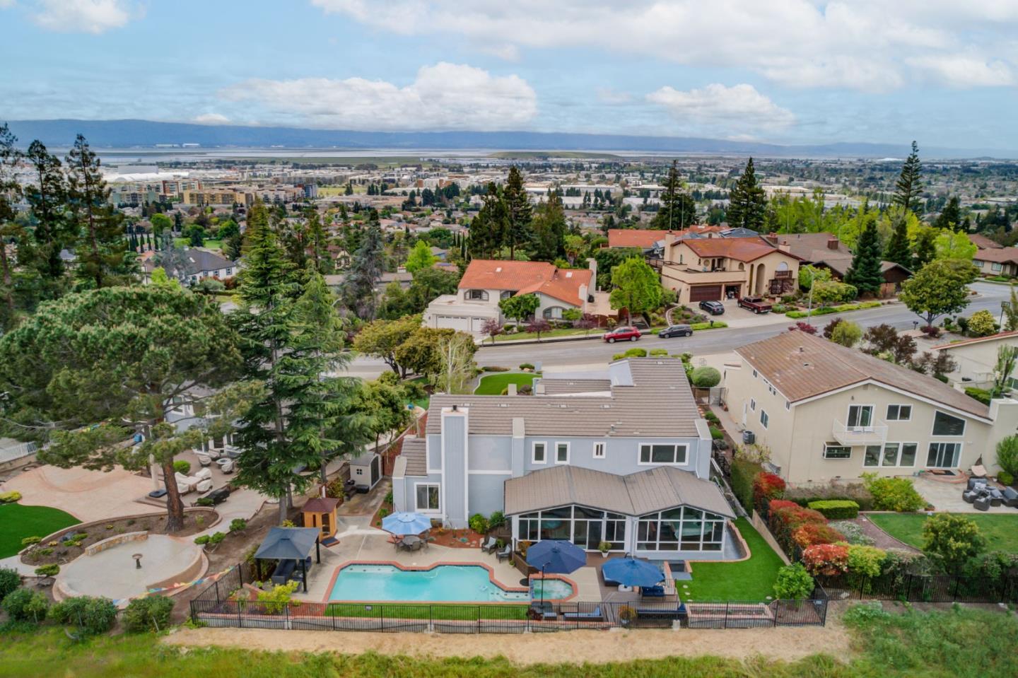 This GEM is perched on top of Weibel and Mission-Hills neighborhood. Breathtaking panoramic views of the picturesque Mission Peak, hang-gliders in the day, mesmerizing hillside house lights at night and full moons. Very spacious and open floorplan w/ a large family room, kitchen, and Sunroom conducive for entertaining. Gated backyard with IR Sauna, Gazebo, pool and jacuzzi, Trex decking ideal to host friends and family during summer season! Two story levels with master ensuite on the first and second floors. All bathrooms have been upgraded w/ floor to ceiling unique Brazilian quartzite bookends shower slabs, matching countertops, custom glass doors, Hansgrohe/Grohe fixtures, new cabinetry. Other upgrades include new main floor HVAC/water heater/windows, Teak hardwood, porcelain flooring, plush carpeting. MasterBR#1 with new custom built-in Cherrywood cabinetry and large windows allowing Mission Hills-Peak panoramic view. Landscaped front and backyard with artificial grass, several fruit trees. Located in a low traffic mature neighborhood, with easy access to 680/880, BART, shopping, highly rated schools, hiking trails, well-kept Arroyo Park for children to play, this retreat is a comfortable tranquil place, balancing family, and work life.