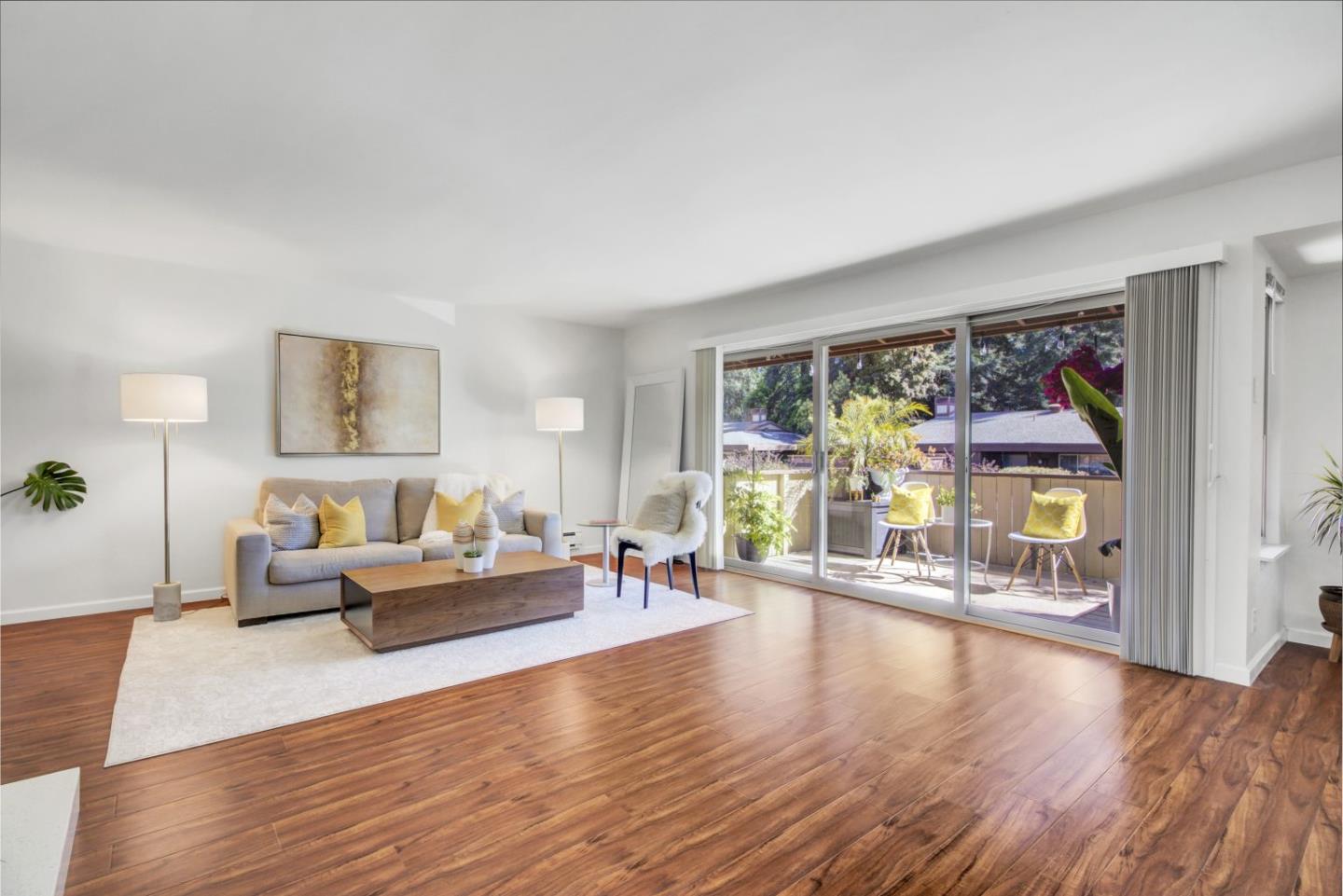 Experience this captivating two-bedroom, two-bathroom single level condo with no one above or below! Nestled in a convenient Mountain View neighborhood this generous layout is nestled in a tranquil corner of the community, boasting easy access to downtown Mt. View Castro restaurants and shops. Enter to an open floor plan that leads to a bright living area with a dining room and state-of-the-art kitchen featuring elegant white shaker cabinetry and luxurious quartz countertops with ample cabinetry. Throughout the home, enjoy luxury laminate flooring, an updated full bathroom, and the convenience of in-unit laundry. Relax in the spacious primary suite with its own private bath tastefully upgraded with white cabinetry, quartz, and marble countertops, along with new tile flooring. Step out onto the expansive private outdoor deck, perfect for entertaining & quintessential living. Community amenities include a heated pool, sauna, clubhouse, electric car chargers & a Rec Room equipped w/ ping pong, fireplace, TV & kitchen. Parking is convenient with one dedicated covered spot plus open parking. Top rated schools and located in the heart of the tech scene, with quick access to highways 85, 101 & Central Expressway.