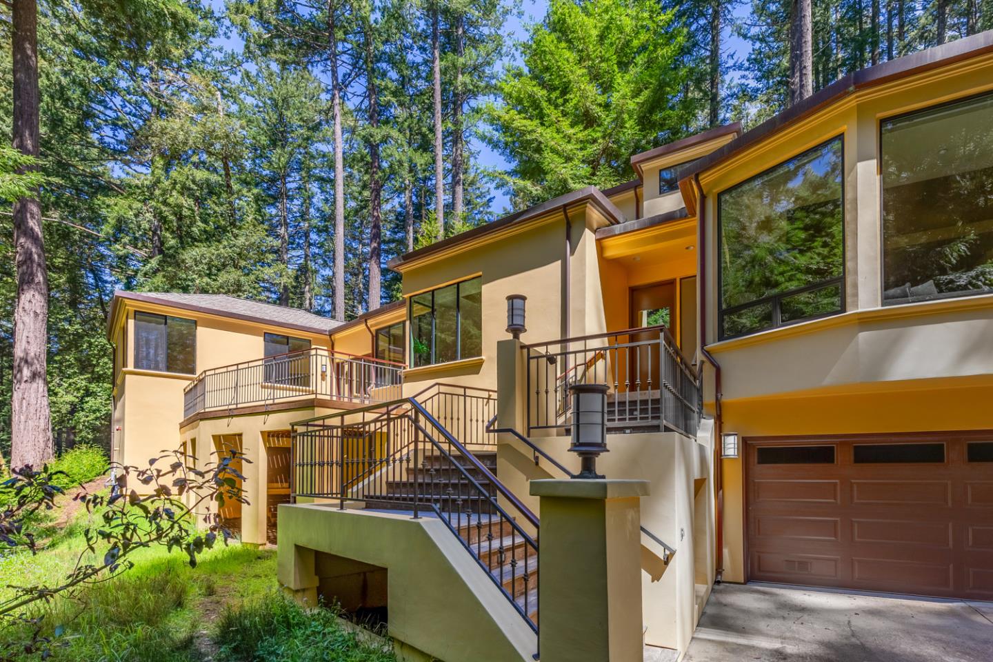 Contemporary with clean lines and total privacy, secluded in the redwoods on 5.6 acres just off Skyline with midway convenience to either Highway 92 or Woodside Road. Absolute privacy and most recently used as a professional recording studio. 3 beds plus an office or reading room with flexible use. Living room open to adjacent step up dining room just off the formal entry. Spacious kitchen with gas cooktop in the island, a large oven with microwave above, side by side refrigerator/freezer and nearby laundry room. The kitchen, informal dining, and family room are open to walls of glass overlooking the forest with access to the patio deck. Large primary suite with custom closet system and modern sleek bathroom. Significant backup generator in the event of power outages. Acclaimed Woodside Elementary School. Miles of hiking trails all around.