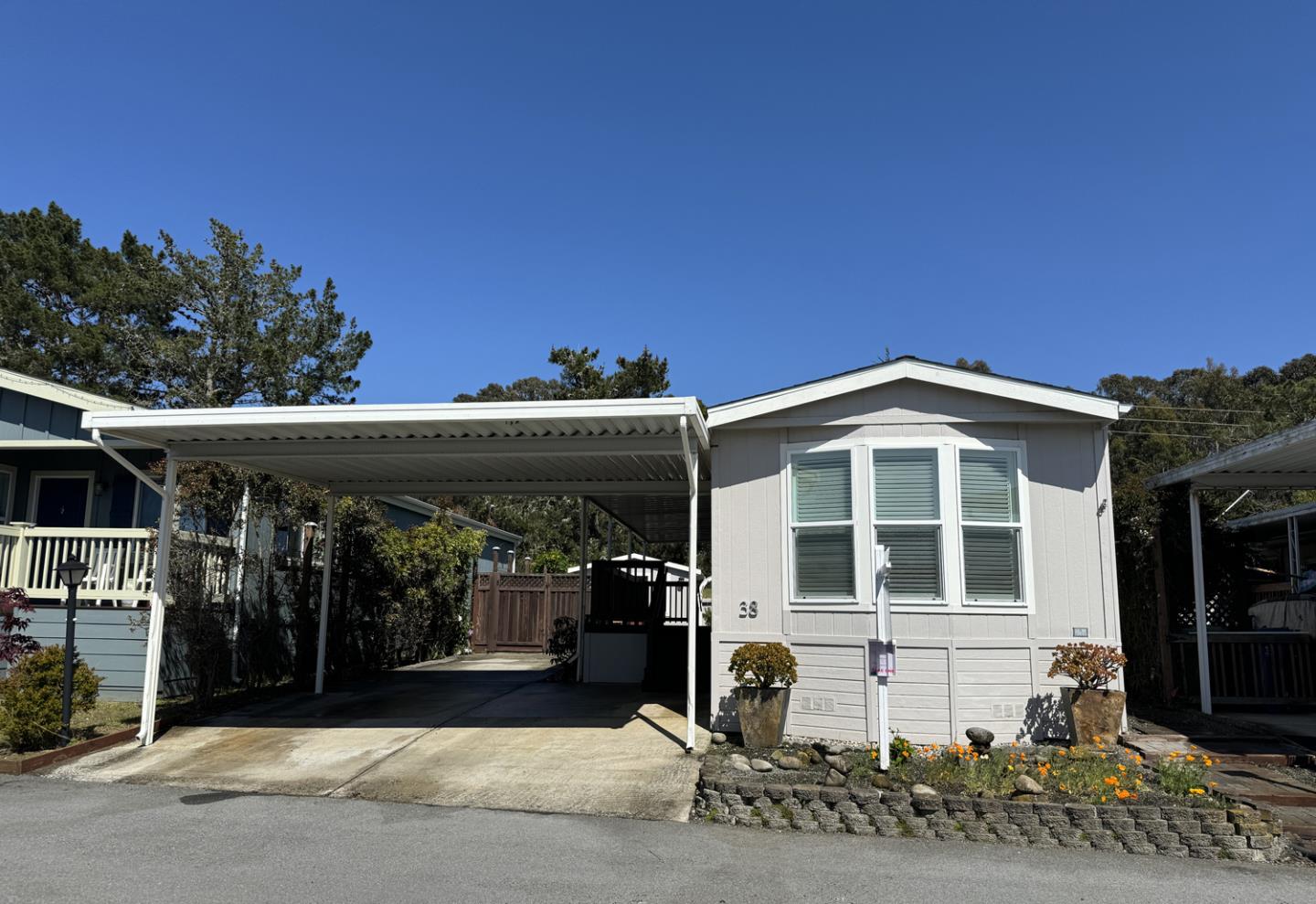 This sweet move-in-ready Cañada Cove manufactured home has many features to appreciate. Open floorplan with tasteful flooring throughout, adorable bright kitchen with a huge skylight making it a well-lit and inviting space to prepare your meals. Lovely granite countertops, white cabinetry, quality appliances and corner sink overlooking the porch. The bathroom also has a wonderful skylight, beautiful stone walk-in shower with glass door, and a dual-sink vanity. Spacious laundry room offers side-by-side washer/dryer set, good storage space and access to a beautiful stone patio with colorful flowers, fountain and detached bonus structure with ceiling fan and window. A great space that could be used for storage, home office, or art studio, just to name a few possibilities. Cañada Cove Mobile Home Park has a seasonal heated, saline pool, well-equipped excerize room and clubhouse facility that offers many events and opportunities for its residents to participate in. It is a friendly and joyous 55+ community. If you are ready to live the easy life come and see 38 Seascape Drive in Half Moon Bay!