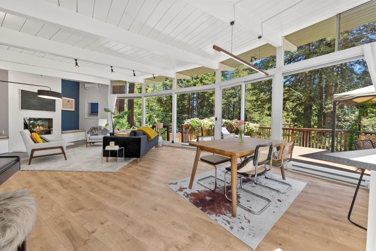 Welcome to your modern sanctuary nestled in the serene Santa Cruz Mountains! This stunning mid-century modern home boasts captivating floor-to-ceiling windows in the living room, inviting the breathtaking natural beauty indoors. Almost fully renovated in 2022, this residence seamlessly blends contemporary elegance with timeless charm. The open layout effortlessly flows into a gourmet kitchen, featuring sleek concrete countertops and top-of-the-line appliances, catering to culinary enthusiasts and gatherings alike. Retreat to the tranquil bedrooms, where comfort meets style. The primary suite is a haven of luxury, complete with a den/office and a bonus spa-like bathroom, providing an indulgent escape from the everyday hustle and bustle. Step outside to your own private oasis, spanning almost half an acre of sun-drenched land with fruit trees and plenty of space to garden! Whether you're unwinding on the expansive deck or planting vegetables in the covered planters, the possibilities for outdoor enjoyment are endless.
