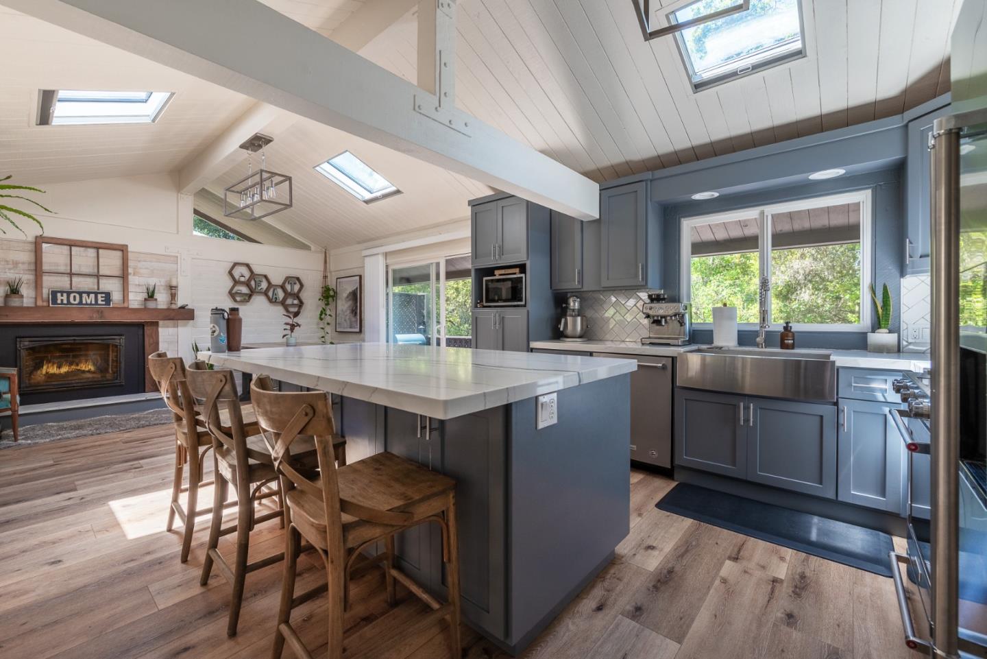 The best deal in Aptos!!! One of a kind home located on a quiet country lane in the Aptos Hills, in a tightknit neighborhood that has an annual Halloween Parade, July 4th BBQ, and sparkling decorated homes at Christmas. Brimming with designer touches, this home is loaded with warmth and character throughout. Kitchen, baths and the entire interior have been refurbished within the last few years and look amazing! A kitchen to die for with farm style stainless sink, custom cabinets, large island, open beam ceilings. The family room and separate living room both have fireplaces and direct access to the rear deck. The primary bedroom and laundry room are both located on the ground floor. The kitchen and bathrooms are beautiful- modern, updated but with an understated French country elegance.
