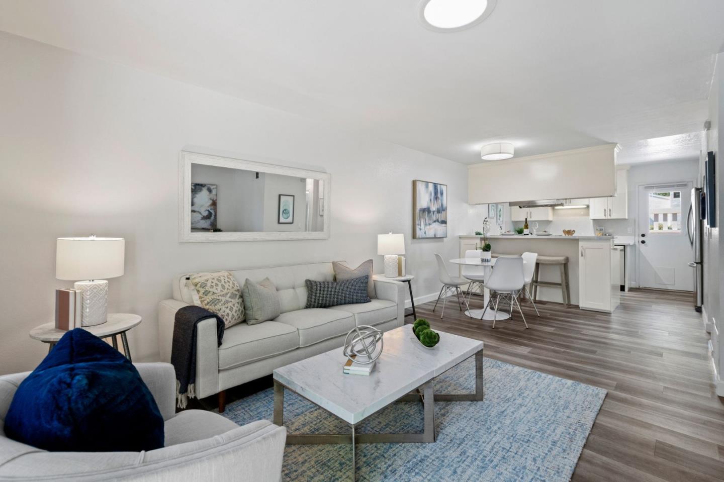 This quaint and rarely available single-story end-unit townhome is nestled in a highly desirable Sunnyvale neighborhood. Open floor plan concept with incredible private patios in the front and back of the unit that adds tremendous natural light. Gorgeous wide plank flooring throughout. The updated kitchen features beautiful cabinets, quartz countertops, and stainless steel appliances. This idyllic community also offers fantastic amenities, including a clubhouse, pool, and picnic areas. The unit features a huge front setback and extra unassigned parking spots, in addition to a private one-car garage. Situated just moments from Highway 280, Sunnyvale Community Center, Sunnyvale Senior Center, parks, and shopping, this location is ideal for commuters and families alike.