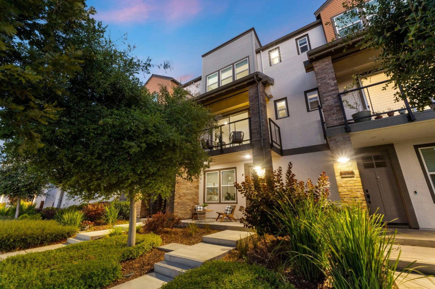 Welcome to this modern, luxurious three-story townhouse, perfectly situated in the desirable Vale community in Sunnyvale. Built in 2018, this home offers a contemporary floor plan designed for comfortable living. The ground level features a versatile guest suite, ideal for long-term guests, multigenerational families, or a home office. The second floor showcases a bright, airy living area with large dual-pane windows and wide-plank laminate floors, leading to a gourmet kitchen equipped with white cabinets, stainless steel appliances, quartz countertops, a walk-in pantry, and a generous island. The dining area bridges the kitchen and the spacious living room, which opens to a private balcony. The top floor hosts the primary suite, complete with two walk-in closets and an oversized bathroom with dual sinks and a spacious shower. The laundry closet and a secondary guest bedroom with an ensuite bathroom finish off the third floor. Parking is available within the attached 2 car garage w/epoxy flooring. The well-designed community offers low HOA fees that cover landscaping, walking trails, playgrounds, and clubhouse. Ideally located near major tech companies like Amazon, Apple, Google, and Nvidia, and just minutes from Downtown Sunnyvale's dining, shopping & entertainment.