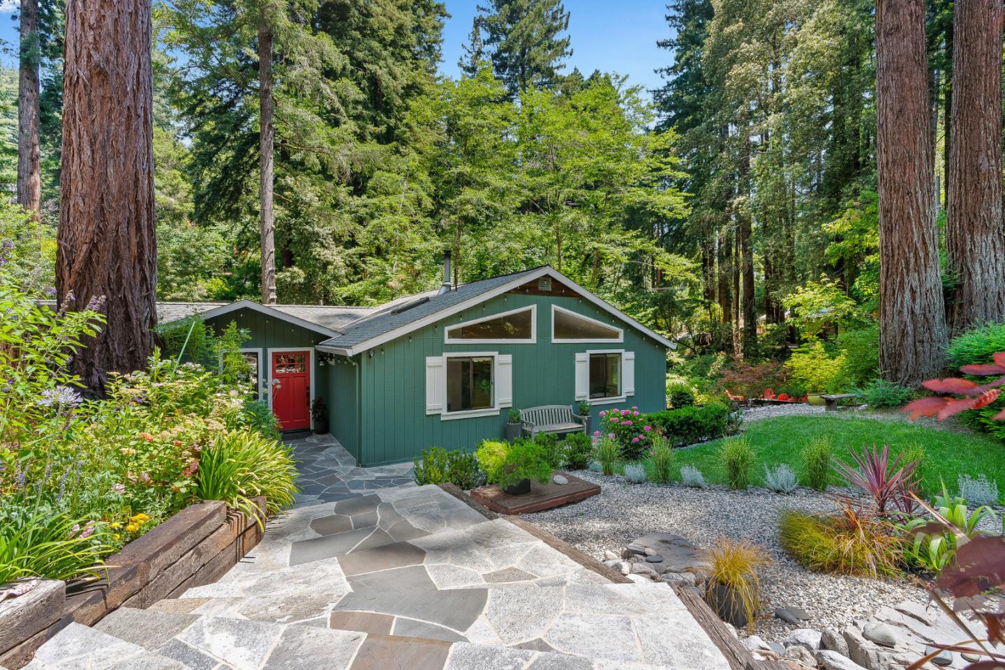 This exquisite riverside sanctuary features gorgeous gardens. Past the gate, the river splashes by while a trio of redwoods stand sentry. Rebuilt & expanded in the 1980s w/ permits, using redwood harvested from the property, it's meticulously maintained & enhanced by quality materials. A stone pathway beckons you inside, where the main level has two bedrooms, open living room & dining area, & kitchen. The riverside deck is ideal for relaxing & enjoying our idyllic climate. Picture windows blend the home & forest. 3 rooms downstairs, including a bedroom, are accessible via stairs or separate entrance. Great separation for multi generational living / working from home. The kitchen features idyllic views, hickory cabinets, quartz counters, quality Samsung & LG appliances & a generous pantry. Large primary suite has a sitting area, walk in closet, & en-suite bath (was 2 bedrooms). The living room is graced by airy vaulted ceilings, bamboo flooring & a woodstove. Comfortable radiant heat, public utilities, high speed internet, propane, & 2 year new engineered 4 bed septic. Workshop, storage shed, metal carport & lots of parking. Friendly neighborhood, private swimming hole. About 40 minutes drive to Santa Cruz or Silicon Valley; 10 to restaurants, grocery stores, & conveniences.