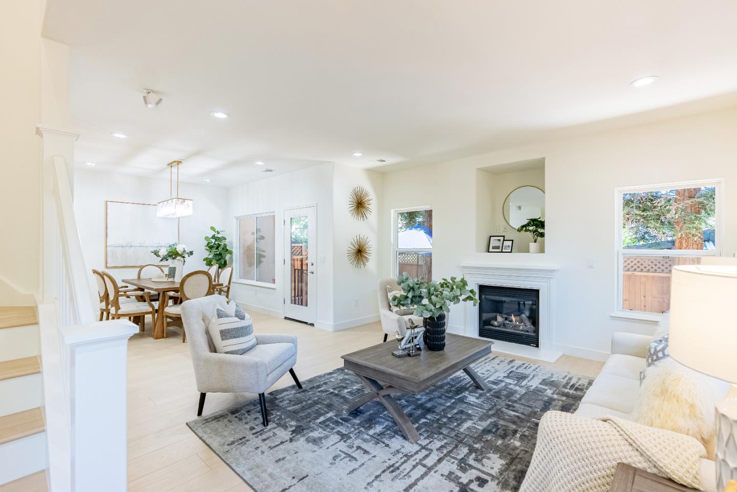 Towering end-unit townhome in a location dreams are made of, only a couple steps to Downtown Sunnyvale where you can enjoy a variety of restaurants, fresh finds at the weekly Farmer's Market, see a movie or go on a Caltrain adventure. Inside, you'll find a welcoming open floor plan w/ new wood flooring and fresh paint. High ceilings w/ recessed lighting and abundant dual-pane windows offer picturesque views of majestic redwood trees. The home is equipped w/ heat/AC, a cozy gas fireplace, and a large laundry room w/ a washer/dryer and ample storage. Gourmet kitchen boasts brand name appliances, granite countertops, plenty of cabinet space w/ matching wood-paneled refrigerator and large dining area. Each bedroom is bright, spacious, pre-wired w/ Cat-5, and features its own closet. Primary bedroom includes a walk-in closet and en-suite bathroom including a tub w/ window above, stall shower and dual sinks. Additional features include a two-car garage and private backyard oasis with five heritage redwood trees, perfect for entertaining. Besides a perfect Downtown location you're also near parks, shops and major tech giants (LinkedIn, Google, Apple, Etc.) w/ easy access to HWY 101, 237 and Central Expy. Do not miss your chance to own this perfectly located stunner. It will go FAST!