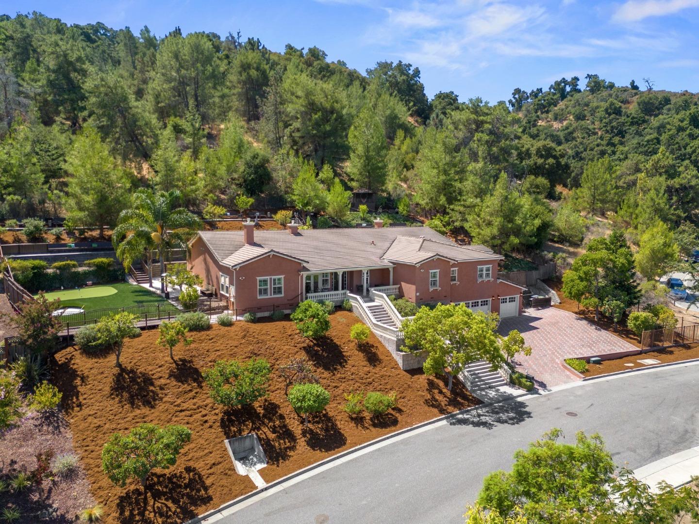 Set against Heintz Open Space w/ breathtaking views & private cul-de-sac location! Popular Heritage Grove neighborhood, convenient access to Vista & Valley View Hiking Trails, Belgatos Park & Hwy 85. Perched for great views, grand staircase entry leads to spacious front porch. Inside, soaring ceilings & rich hdwd flrs thru-out. Picturesque views of SF Bay Area-Wow! Formal dining & living rms centered around fireplace w/ access to rear grounds. Lg kitchen features quartzite countertops, Viking appliances, center island, & walk-in pantry opens to great rm equipped w/ built-in surround sound, Epson projector & gas fireplace. Lg windows showcase outdoor space & views of spectacular waterfall w/ mosaic design. Sweeping front views frm primary suite w/ adjacent ofc has French doors to front porch. Stunning marble fireplace, lux bath has dual vanities, soaking tub, & spacious stall shower. 3 more bdrms- en-suite & 2 share adjoining bath. Rear yard is park-like paradise-meandering paths wind thru terraced gardens, fruit trees, sitting areas, bridges. Privacy enjoyed by mature tree-line. Stunning sunsets frm numerous vantage points. Sharpen your skills on putting green or lounge on the deck! A highly sought-after location, easy access to nearby parks, top-rated schools, & easy commute!