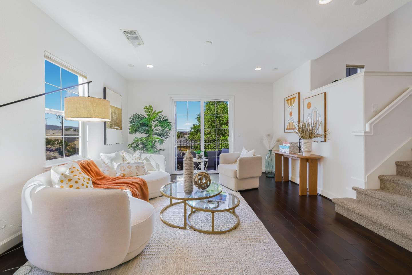 Welcome to this beautifully upgraded end-unit townhome in central Santa Clara. This home features hardwood flooring and large windows, filling the open-concept second floor with natural light. The kitchen offers a center island, quartz countertops, stainless steel appliances, and a gas cooktop, perfect for cooking and entertaining. The living room opens to a private balcony for outdoor enjoyment. The first-floor junior suite includes a private patio, ideal for guests or a home office. Upstairs, the primary suite has a walk-in closet and dual sinks in the bathroom, while an additional bedroom suite provides comfort for family or visitors. Community perks include a park, BBQ area, and playground. Located near Apple, Nvidia, and Google, with easy access to highways, shopping, and dining. The attached 2-car garage provides extra storage, and the low HOA fees make this home a great find.
