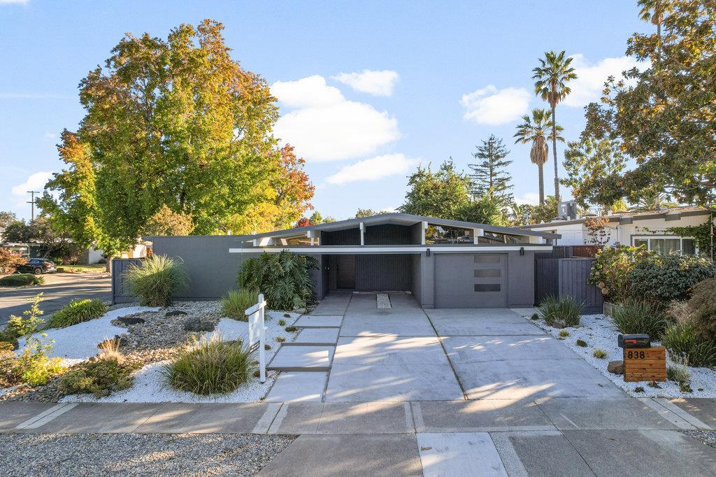 This completely remodeled Eichler showcase home, inspired by Vastu and Feng Shui principles for harmonious 21st-century living, boasts exceptional curb appeal and is nestled along a tree-lined street on a spacious lot in the desirable Fairwood neighborhood. The family room is bathed in natural light from four elevated skylights, creating an open and welcoming atmosphere. The gourmet kitchen is a chef's delight, featuring quartz countertops, custom cabinetry, a spacious island, and stainless steel appliances. The open floor plan seamlessly connects the living spaces, accented by designer lighting, and signature floor-to-ceiling glass that creates an effortless blend between indoor and outdoor spaces. Modern upgrades include a 200-amp electric panel and a EV charger outlet. Step outside to the professionally landscaped backyard, a serene retreat for leisurely afternoons or starlit evenings, complete with an expansive lawn and mature greenery. This home offers an ideal balance of sophisticated interiors and inviting outdoor spaces, perfect for those who appreciate both style and comfort. Conveniently located near Google, LinkedIn, Apple Spaceship Campus, Meta, Nvidia, and other tech hubs, and zoned for award-winning Cupertino schools: Stocklmeir, Cupertino Middle, and Fremont High.
