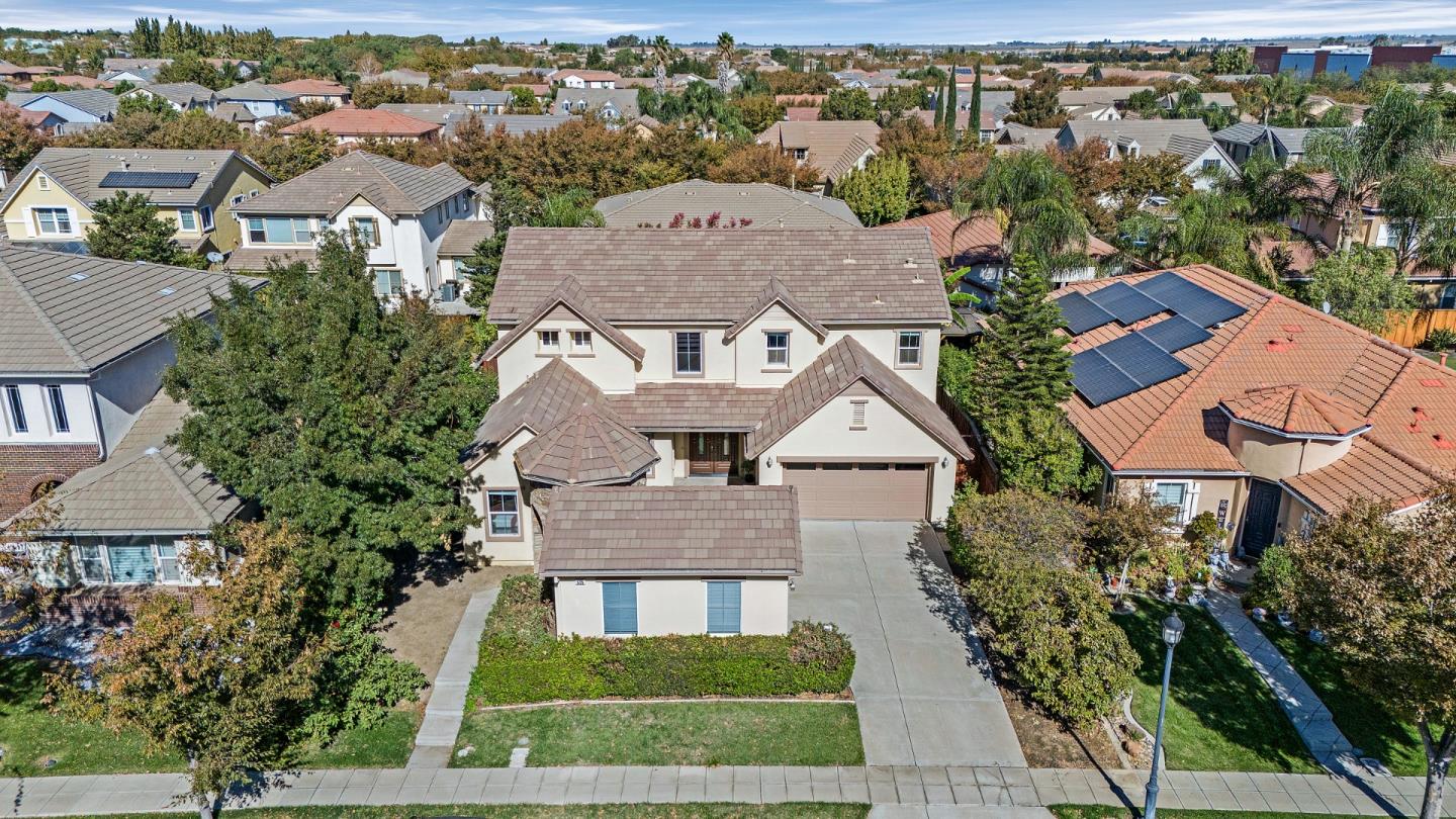 This stunning two-story home, built in 2003, is located in the desirable Wicklund Village of Mountain House and boasts 3,182 sq ft of living space on a 6,993 sq ft lot. With four bedrooms, three full baths, and three garages, it provides ample space for both living and entertaining. The curb appeal is enhanced by a gazebo-like structure with stone accents, offering a welcoming outdoor area. A set of double entry doors opens to a dramatic foyer with travertine tile flooring and a dark wood staircase, leading to an open living and dining room with rich, dark wood floors. The kitchen features granite countertops, a center island, and modern appliances, while the adjacent nook includes a built-in desk and sliding glass door to the backyard. The family room offers a cozy fireplace and large windows for natural light. The ground-floor bedroom and bathroom provide convenient access and luxurious features. Upstairs, the primary bedroom offers a spacious retreat with a spa-like bathroom and walk-in closet. The home also includes a large loft for versatile use, two additional bedrooms, and a laundry room. The backyard features a stamped concrete patio and fruit trees, while the spacious driveway offers extra parking. Best of all, there are no HOA fees!