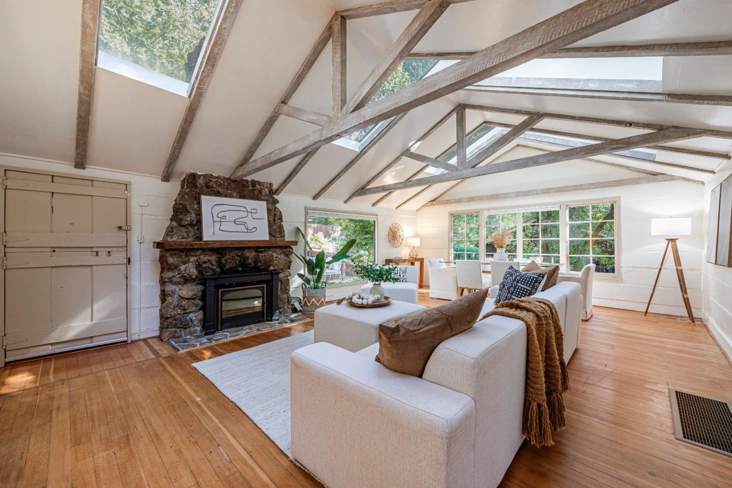 Abundant skylights throughout this charming woodsy cabin fill the home with sunlight and create a peaceful, inviting retreat just moments away from the bustle of Silicon Valley. The newly remodeled kitchen offers crisp white counters, cabinets, and a contemporary tile backsplash plus a mudroom laundry area with updated appliances. There are natural hardwood floors and vaulted ceilings in the living room, kitchen, and bedrooms. A large bedroom, full bathroom, kitchenette, and family room on the lower level could be used as a guest suite or ADU with separate entrance. Upgrades include new electrical panel, AC, back-up generator, cast iron wood stoves, and outdoor pizza oven. Multiple fruit trees, a small meadow, and a seasonal creek grace the backyard and are lightly shaded by elegant redwood trees. This one-of-a-kind home is served by Portola Valley's highly acclaimed elementary and middle schools, and is a short stroll to Alices Restaurant, Four Corners, and stunning trails for hiking or biking. Come see all that 223 Blakewood has to offer!
