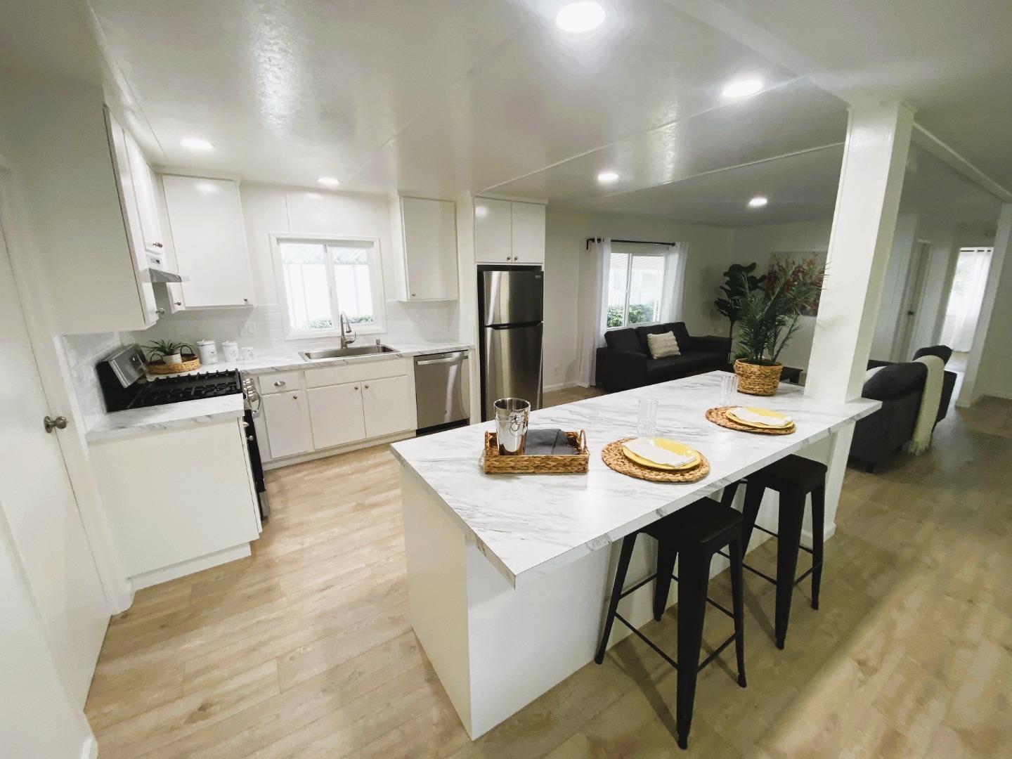 Stunning New Remodel! Low Space Rent! Three Bedrooms. Double pane windows. Spacious kitchen with new cabinetry and stainless appliances. Breakfast bar. Large open floorplan. Great for entertaining. New laminate flooring throughout and new carpet in the bedrooms. Lots of attention to detail. New lighting throughout. Beautifully remodeled bathrooms. Separate laundry room. Located in the highly desirable mobile home park, Quail Hollow Mobile Home Community of Willow Glen (55+ Age Requirement). Close distance to great shopping, dining and public transportation. Space rent $1,058.