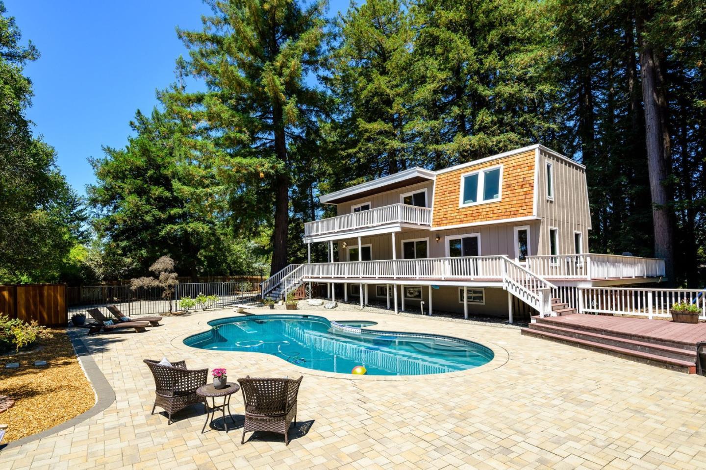 Experience the ultimate family retreat in the peaceful Los Gatos Mountains. This 1.8-acre property seamlessly blends natural beauty with modern amenities. Featuring a sun drenched in ground pool and patio in front and a peaceful redwood grove in the back it offers the perfect balance of sun and shade. Ideal for entertaining, the home boasts expansive decks, patios, and views that capture the essence of mountain living. The residence offers four bedrooms and three full baths, including a convenient ground-floor bedroom and bath. The Primary Suite is a true sanctuary, with a large walk-in closet, an ensuite bath with a large walk in shower and dual sinks and a deck that offers sweeping mountain views and a glimpse of Monterey Bay. An outbuilding beyond the redwood grove is perfect for a home office, while the versatile downstairs bonus space lends more options. Top Rated Schools include: Loma Prieta Elementary, CT English Middle and Los Gatos High. Additional features include: Outdoor movie projector, owned solar panels, two Tesla Powerwall Home Batteries w/ a 240V electric car charger. Located just 3 miles from Summit Store, 15 miles to Los Gatos and 11 miles to the beach at Capitola. Don't miss this rare opportunity to own the perfect blend of nature, privacy, fun and luxury.