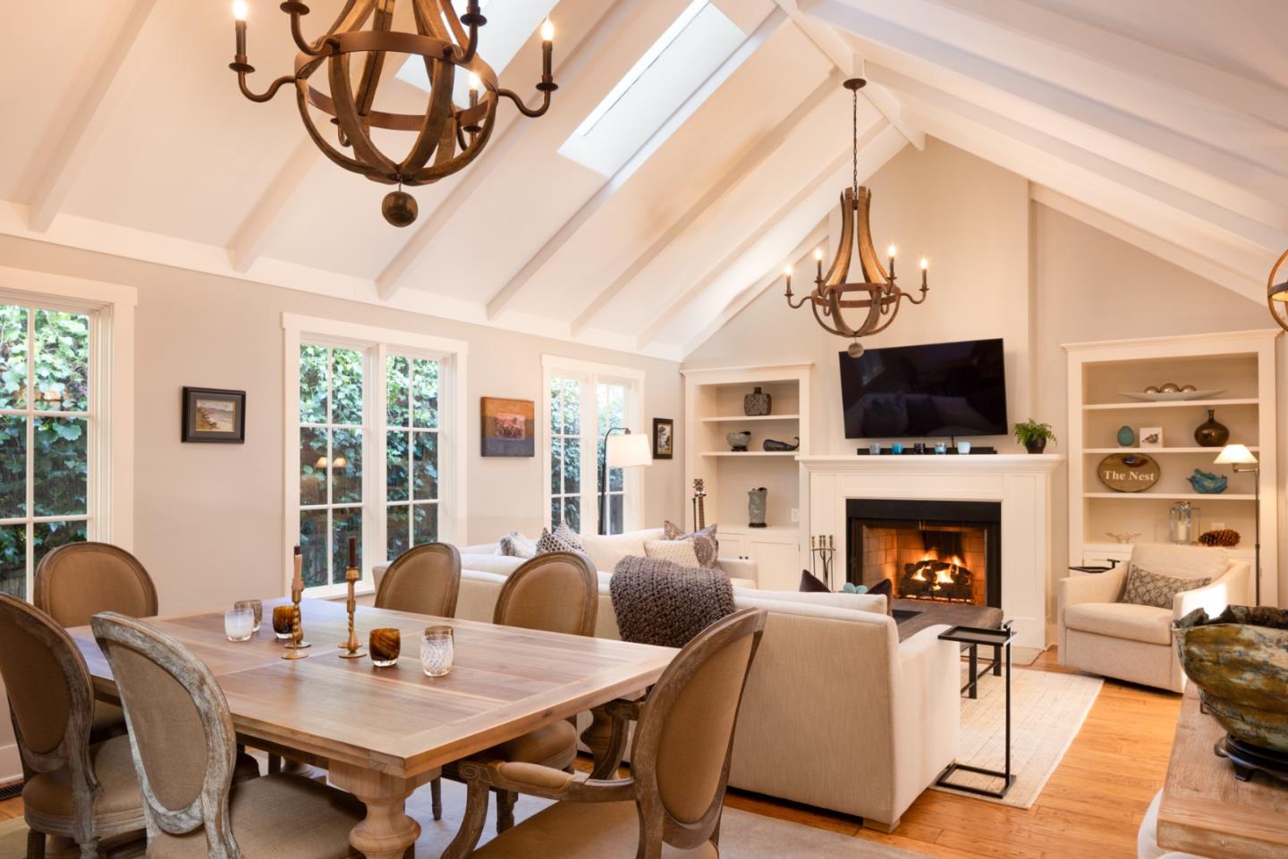 Welcome to The Nest - a charming Carmel cottage just four blocks from the beach and a short walk to town. This warm and inviting home features a stylish Belgian-inspired interior with a formal living room, dining area and family room all featuring high vaulted ceilings, cozy fireplaces, and vintage wooden light fixtures. The renovated gourmet kitchen opens to the family room with a fireplace and features gorgeous French oak cabinetry, custom stone walls and an elegant La Cornue stove. The primary bedroom faces the garden, opens to its own little porch for coffee or cocktails, and includes an en-suite bathroom with a soaking tub. The second bedroom has a built-in bed with storage and a work area, while the third bedroom offers a private retreat. A two-car garage includes laundry and ample storage. The property also boasts a tranquil garden and fire pit, ideal for relaxing or entertaining. Carmel charm with elevated design and easy walks to town and beach make this the perfect Carmel retreat.