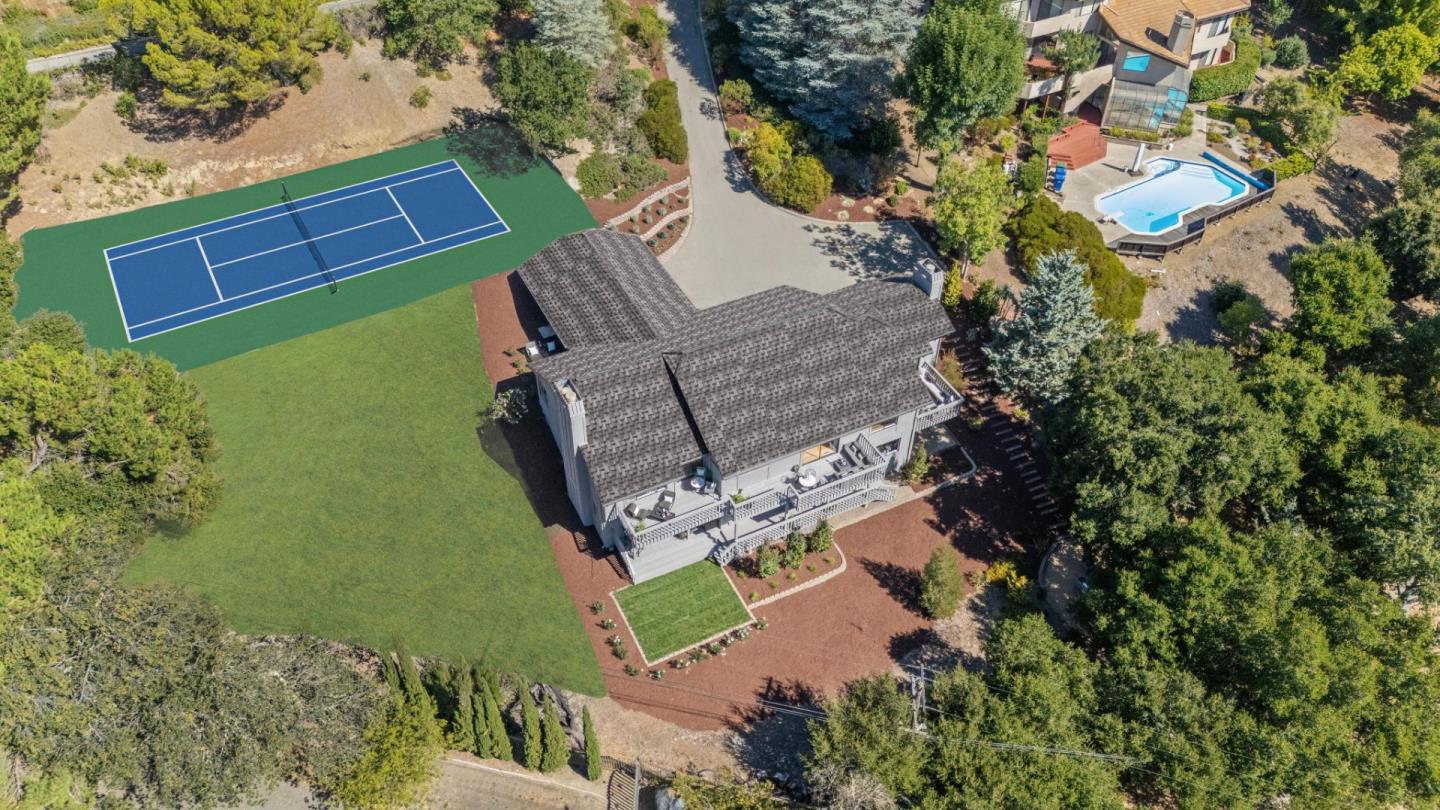 A rare find in the hills - close to town, minutes to shops, parks and schools, large flat area, and move-in ready 5 bedroom home with nice bones. Sophistication of a parquet floor in the entryway leads to a sunken family room with cathedral ceilings anchored by a beautiful fireplace flanked by windows. Separate formal dining space has a large picture window and access to a lovely deck from a sliding door. The kitchen is large with an eat-in area and stainless steel appliances. A very generous primary suite and a second bed and bath are on this level. The family room has a large slider to the back deck and lawn plus a bar for entertainment. Three additional bedrooms are served by a hall bath on this level. Large laundry and mudroom plus a three car garage. The older tennis court in the side yard can either be restored or removed for other use of this wonderful flat space. Walk or easy bike ride to Los Altos Rancho shopping center yet secluded and very private. *VIRTUAL PHOTOS OF TENNIS COURT AND YARD ARE FOR ILLUSTRATION PURPOSES ONLY*