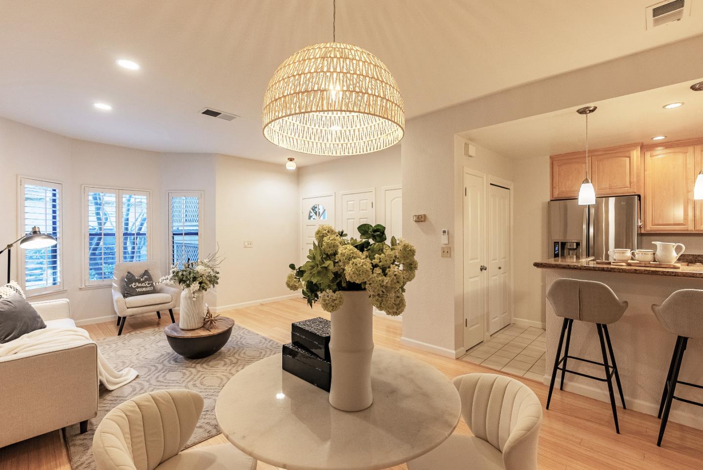 Discover this newly remodeled high ceiling townhome, nestled in a tranquil, park-like community just a short stroll from parks, schools, and less than a mile from downtown Sunnyvale. This inviting home boasts an open floor plan with bamboo flooring, recessed lighting, and tons of natural light streaming through an abundance of windows, which feature plantation shutters. The gourmet kitchen seamlessly blends functionality and elegance with high-end stainless-steel appliances, granite countertops, ample cabinetry, breakfast bar and cozy dining area. Two spacious bedroom suites feature large closets, providing plenty of storage. The updated bathroom showcases a unique bowl sink, marble countertops and walls, ceramic flooring and a shower/tub combo. Additional highlights include a newly installed split Heat/AC unit and water heater, laundry closet with washer/dryer, two-car garage and a sun-filled patio. Enjoy community amenities such as a sparkling pool and spa, completing the lifestyle of comfort and ease. Ideally located near popular dining, shopping, parks, and major tech companies like LinkedIn, Google, and Apple, with convenient access to Highway 101, 237, Central Expressway, and Caltrain. Do not miss your chance to own this newly remodeled stunner. It will go FAST!