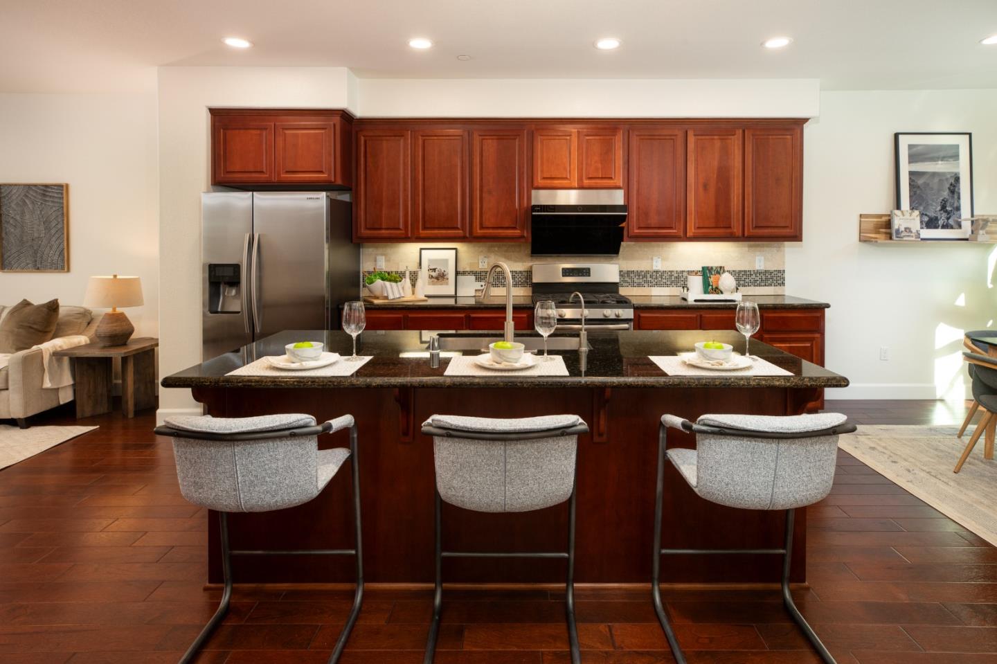 Do not miss your opportunity to see this stunning 10-year-new townhome in the heart of Silicon Valley! This gorgeous home offers three generously sized en-suite bedrooms, including one on the first floor - perfect for guests, family, or a home office. The open-concept dining, kitchen, and living areas flow seamlessly, creating an inviting space for both daily living and entertaining. For added convenience, the laundry is located upstairs, right near the primary bedroom, making everyday chores a breeze. Outside, the community offers abundant amenities, including a BBQ area, pool, spa, and a redwood-lined trail that brings outdoor enjoyment and relaxation. Its prime location provides easy access to NVIDIA, Apple, and many other top tech companies, as well as parks, authentic restaurants, grocery stores, and excellent private schools. Tucked away in the very center of a quiet, peaceful community, this home offers the perfect blend of tranquility and accessibility.