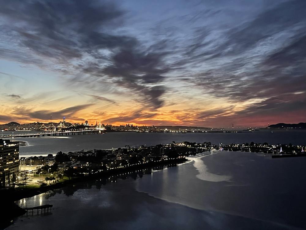 Spectacular panoramic views of the San Francisco Bay & a luxurious lifestyle high atop Emeryvilles full-service Pacific Park Plaza. Multi-million dollar building renovations including dynamic contemporary aesthetic, custom curated art, light fixtures, elevator doors, refreshed gardens, elegant lobby. 24th floor corner unit. 1144+/-SF 2 bds 1.5 bths w/approved plans for full-bath expansion. Open floorplan w/views from every room. Access to 2 balconies. Hardwood & carpet. 10-foot ceilings. Walls of windows. Generous living room w/entertainment ctr. Dining area w/view windows. Galley-style kitchen. Upper glass-faced cabinets. Breakfst bar. New LG frig, GE dishwasher, microwave, like-new electric range. Primary suite w/rm to create addl storage. 2nd bdrm features outstanding views. Dual-zoned HVAC. 24/7 security. Concierge service, on-site maintenance staff. Free dedicated Paxio & Comcast high speed fiber optic internet. Laundry rm on each flr Nearby Tesla charging station. Reserved parking space in secured parking garage plus addl may be transferrable at $25/mo. Some furniture included in sale. 2000 SF common area, wet bar, gym w shwrs, pool, spa, tennis/pickleball cts. Near Berkeley Public Market, Bay Street, 9 mi to SF, 4 mi to UC Berkeley, steps to shopping, dining options.