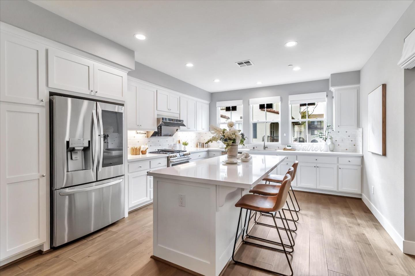 Modern 5-Year-Old Townhouse with Premium Upgrades!This stunning townhouse features an open floor plan with abundant natural light and high-end finishes. A master suite on the ground floor offers privacy, while a dedicated office space with a built-in desk is perfect for remote work. The modern kitchen boasts quartz countertops, trendy cabinets, and stainless steel appliances. Enjoy the breeze from the balcony with scenic views. Upstairs are two spacious master suites with elegant bathrooms. The home is equipped with a Tesla solar system, Powerwall backup, smart light switches, and motorized shades for select windows. A whole house fan provides immediate cool air on hot summer days, in addition to separate zoned AC. Located near Hi-Tech companies with quick access to Highway 101, 237, and Downtown Sunnyvale. Dont miss this rare opportunity!